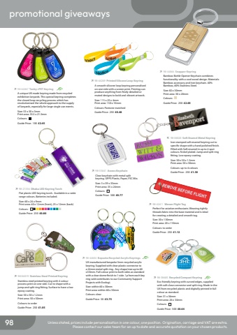 conference & exhibition promotional giveaways98 Unless stated, prices include personalisation in one colour, one position. Origination, carriage and VAT are extra.Please contact our sales team for an up to date and accurate quotation on your chosen products.%uf0ec%u000998-04019 Stainless Steel Printed KeyringStainless steel printed keyring with 4 colour process print on one side. Cut to shape with a jump and split ring fitting. Surface to have a low epoxy coating.Size: 50 x 50 x 1.2mmPrint area: 50 x 50mmColours: to orderGuide Price: 250 %u00a31.05%uf0eb%u000998-04020 Soft Enamel Metal KeyringIron stamped soft enamel keyring cut to specific shape with a hand polished finish. Filled with Soft enamel in up to 4 spot colours. Nickel plated. Jump and split ring fitting. Low epoxy coating.Size: 50 x 50 x 1.5mmPrint area: 50 x 50mmColours: up to 4 coloursGuide Price: 250 %u00a31.30 %uf0ec%u000998-35641 Access KeychainClear keychain with metal split keyring. GPPS Plastic, Paper, FSC Mix.Size: 3 x 59 x 35mmPrint area: 35 x 24mmColours: %uf0a2Guide Price: 500 %u00a30.77%uf0ec%u000998-38685 Recycled Compact KeyringEco friendly keyring with curved edges, supplied with soft close connector and split ring. Made in the UK from recycled plastic and digitally printed in full colour as standard.Size: 31 x 36mmPrint area: 26 x 34mmColours: %uf0a2Guide Price: 500 %u00a30.64%uf0ec%u000998-42411 Woven Flight TagPerfect for aviation enthusiasts. Weaving tightly threads fabric into the base material and is ideal for creating a detailed and smooth tag.Size: 30 x 130mmPrint area: 20 x 110mmColours: to orderGuide Price: 250 %u00a31.12%uf0ec%u000998-44269 Printed Silicone Loop KeyringA smooth silicone loop keyring personalised on one side with a screen print. Printing can produce anything from finely detailed or muted designs to bold and vibrant artwork.Size: 115 x 25 x 4mmPrint area: 150 x 10mmColours: Pantone matchedGuide Price: 250 %u00a30.48%uf0ec%u000998-44867 Tenby rPET KeyringA unique UK made keyring made from recycled exhibition lanyards. This special keyring completes the closed loop recycling process which has revolutionised the whole approach to the supply of lanyards, especially for large single use events.Size: 53 x 30 x 3mmPrint area: 35.5 x 21.3mmColours: Guide Price: 100 %u00a32.45%uf0ec%u000998-44604 Bepsoke Recycled Acrylic KeyringsUK manufactured bespoke 3mm recycled acrylic keyring. Supplied with clear plastic connector to a 24mm metal split ring. Any shape/size up to 60 x3 0mm. Full colour print to both sides as standard with a clear dome finish to 1 side. 1p from each key ring sold contributes to our Community Support Projects with Ecologi.Size: within 60 x 30mmPrint area: within 60 x 30mmColours: clearGuide Price: 50 %u00a33.75%uf0ec%u000998-44866 Snapper KeyringBamboo Bottle Opener Keychain combines functionality with a cool wood design. Materials: Bamboo accessory and Iron keychain. 40% Bamboo, 60% Stainless Steel.Size: 82 x 30mmPrint area: 30 x 20mmColours: Guide Price: 250 %u00a32.05%uf0ec%u000998-21336 Dhaka LED Keyring TorchFlat plastic LED keyring torch. Available in a wide range colours. Batteries included.Size: 60 x 24 x 9mmPrint area: 40 x 12mm (front), 25 x 12mm (back)Colours: %uf0a2%uf0a2%uf0a2%uf0a2%uf0a2%uf0a2%uf0a2%uf0a2%uf0a2%uf0a2%uf0a2Guide Price: 250 %u00a30.80
