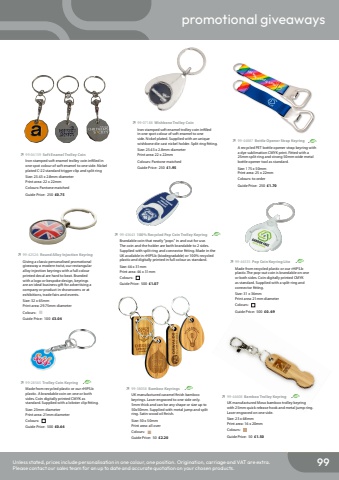 99promotional giveawaysUnless stated, prices include personalisation in one colour, one position. Origination, carriage and VAT are extra.Please contact our sales team for an up to date and accurate quotation on your chosen products.%uf0ec%u000999-07188 Wishbone Trolley CoinIron stamped soft enamel trolley coin infilled in one spot colour of soft enamel to one side. Nickel plated. Supplied with an unique wishbone die cast nickel holder. Split ring fitting.Size: 23.43 x 2.8mm diameterPrint area: 22 x 22mmColours: Pantone matchedGuide Price: 250 %u00a31.95%uf0ec%u000999-44535 Pop Coin Keyring LiteMade from recycled plastic or our rHIPS.b plastic.The pop-out coin is brandable on one or both sides. Coin digitally printed CMYK as standard. Supplied with a split-ring and connector fitting.Size: 31 x 36mmPrint area: 21mm diameterColours: %uf0a2Guide Price: 500 %u00a30. 69%uf0ec%u000999-42526 Round Alloy Injection KeyringGiving a classic personalised promotional giveaway a modern twist, our rectangular alloy injection keyrings with a full colour printed decal are hard to beat. Branded with a logo or bespoke design, keyrings are an ideal business gift for advertising a company or product in showrooms or at exhibitions, trade fairs and events.Size: 32 x 65mmPrint area: 29.75mm diameterColours: %uf0a2Guide Price: 100 %u00a33.04%uf0ec%u000999-38058 Bamboo KeyringsUK manufactured caramel finish bamboo keyrings. Laser engraved to one side only. 5mm thick and can be any shape or size up to 50x50mm. Supplied with metal jump and split ring. Satin wood oil finish.Size: 50 x 50mmPrint area: all overColours: %uf0a2Guide Price: 50 %u00a32.20%uf0ec%u000999-04159 Soft Enamel Trolley CoinIron stamped soft enamel trolley coin infilled in one spot colour of soft enamel to one side. Nickel plated C-22 standard trigger clip and split ringSize: 23.43 x 2.8mm diameterPrint area: 22 x 22mmColours: Pantone matchedGuide Price: 250 %u00a30.75%uf0ec%u000999-43643 100% Recycled Pop Coin Trolley KeyringBrandable coin that neatly \The coin and the holder are both brandable to 2 sides. Supplied with split ring and connector fitting. Made in the UK available in rHIPS.b (biodegradable) or 100% recycled plastic and digitally printed in full colour as standard.Size: 46 x 31mmPrint area: 46 x 31mmColours: %uf0a2Guide Price: 500 %u00a31.07%uf0ec%u000999-28565 Trolley Coin KeyringMade from recycled plastic or our rHIPS.b plastic. A brandable coin on one or both sides. Coin digitally printed CMYK as standard. Supplied with a lobster clip fitting.Size: 23mm diameterPrint area: 21mm diameterColours: %uf0a2Guide Price: 500 %u00a30.64%uf0ec%u000999-44887 Bottle Opener Strap KeyringA recycled PET bottle opener strap keyring with a dye sublimation CMYK print. Fitted with a 25mm split ring and strong 50mm wide metal bottle opener tool as standard.Size: 175 x 50mmPrint area: 25 x 22mmColours: to orderGuide Price: 250 %u00a31.70%uf0ec%u000999-44608 Bamboo Trolley KeyringUK manufactured Moso bamboo trolley keyring with 25mm quick release hook and metal jump ring. Laser engraved on one side.Size: 23 x 68mmPrint area: 16 x 20mmColours: Guide Price: 50 %u00a31.50