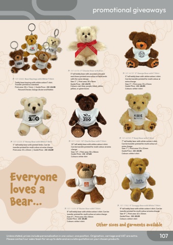107promotional giveawaysUnless stated, prices include personalisation in one colour, one position. Origination, carriage and VAT are extra.Please contact our sales team for an up to date and accurate quotation on your chosen products.%uf0ec%u0009107-42220 5'' Honey Bear with White T Shirt5'' tall teddy bear with jointed limbs. Can be transfer printed for multi colour at extra charge.Print area: 35 x 25mm | Guide Price: 288 %u00a34.09%uf0ec%u0009107-17962 9'' Scraggy Bear with White T Shirt9'' tall teddy bear with white cotton t shirt. Can betransfer printed for multi colour at extra charge.Size: 9%u201d | Print area: 42 x 35mmGuide Price: 288 %u00a35.25Colours: white t shirt%uf0ec%u0009107-44706 5\5\neck bows printed one colour at both ends with the same design.Size: 5%u201d | Print area: 30 x 9mmGuide Price: 288 %u00a33.75Colours: red, blue, purple, black, white, yellow, or green bows%uf0ec%u0009107-44708 7\7'' tall teddy bear with white cotton t shirt. Can be transfer printed for multi colour at extra charge.Size: 7%u201d | Print area: 35 x 25mmGuide Price: 288 %u00a35.95Colours: white t shirt%uf0ec%u0009107-15404 8\8'' tall teddy bear with white cotton t shirt. Can betransfer printed for multi colour at extra charge.Size: 8%u201d | Print area: 50 x 30mmGuide Price: 288 %u00a35.85Colours: white t shirt%uf0ec%u0009107-15403 10\10'' tall teddy bear with white cotton t shirt. Can be transfer printed for multi colour at extra charge.Size: 10%u201d | Print area: 50 x 30mmGuide Price: 288 %u00a37.65Colours: white shirt%uf0ec%u0009107-44707 5\5'' tall teddy bear with white cotton t shirt. Can be transfer printed for multi colour at extra charge.Size: 5%u201d | Print area: 35 x 25mmGuide Price: 288 %u00a34.95Colours: white t shirt%uf0ec%u0009107-43602 Bear Keyrings with White T ShirtTeddy bear keyring with white cotton T shirt.Transfer printed as standard.Print area: 30 x 13mm | Guide Price: 288 %u00a34.50Pictured Chester, George, Buster and Robbie.Everyone loves a Bear%u2026Other sizes and garments available