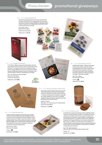 111promotional giveawaysUnless stated, prices include personalisation in one colour, one position. Origination, carriage and VAT are extra.Please contact our sales team for an up to date and accurate quotation on your chosen products.Promo Garden%uf0e8%u0009111-44743 Standard Seed PacketHandy sized seed packet that can be personalised with a full colour label. Select from eight popular seed varieties: Sunflower, Cornflower, Poppy, Wildflower, Butterfly and Bee mixture, Forget me not, Foraged foods and Kitchen Herbs. Growing instructions included.Size: 62.09 x 79mmPrint area: 35 x 18mmColours: per descriptionGuide Price: 50 %u00a31.75%uf0ec%u0009111-44745 Bespoke Seed BookletA 70 x 90mm 300gsm silk board folded booklet with fully personalised artwork and your choice of seed packet inside with over 11 varieties to choose from: Sunflower, Forget Me Not, Poppy, Wildflower, Herb mixture, Butterfly and Bee mixture, Cornflower, Lavender, Xmas Tree, Strawberry, and Summer Flowers. Perfect for spreading your message!Size: 140 x 90mm (70 x 90mm folded)Print area: 140 x 90mmColours: per descriptionGuide Price: 250 %u00a32.90%uf0eb%u0009111-44747 A6 Seed Paper PostcardA lightweight (approx. 140gsm) seed paper A6 Postcard manufactured with natural, biodegradable cotton fibres. Simply lay the paper beneath the prepared soil surface or compost and watch it grow. Perfect for businesses wanting to share personalised messages. Other sizes available.Size: 105 x 148mmPrint area: 93 x 136mmColours: %uf0a2Guide Price: 50 %u00a32.75%uf0e7%u0009111-44746 Natural Kraft Paper Seed EnvelopeKraft paper pocket envelope with a generous full colour print area for your brand. Each envelope contains a standard inner pack of seeds with over 11 varieties to choose from: Sunflower, Forget Me Not, Poppy, Wildflower, Herb mixture, Butterfly and Bee mixture, Cornflower, Lavender, Xmas Tree, Strawberry, and Summer Flowers.Size: 89 x 124mmPrint area: 77 x 112mm (front), 76 x 30mm (back)Colours: per descriptionGuide Price: 50 %u00a32.90%uf0e8%u0009111-44748 Seed Pills Match BoxUnique matchbox packaging. Compact, and recyclable with full colour branding to the box. Matchbox contains a selection of bee and butterfly-friendly wildflower seeds. Vegan capsules (non-edible), made from pullulan, a plantbased material. Positive environmental, impact, encourage, planting wildflowers, to help pollinator populations thrive. The ideal gift for nature lovers, gardeners, and those interested in supporting biodiversity.Size: 50 x 35 x 15mmPrint area: 29 x 44mmColours: %uf0a2Guide Price: 50 %u00a33.95%uf0ec 111-44749 Cylinder Drum KitA cylinder drum-style pot featuring a vibrant, digitally printed wrap around label (lid label available at an additional cost) this seed kit is an excellent way to showcase your branding. The kit includes two Cocopress%u00ae compost tablets, a seed packet of your choice with over 11 varieties to choose from: Sunflower, Forget Me Not, Poppy, Wildflower, Herb mixture, Butterfly and Bee mixture, Cornflower, Lavender, Xmas Tree, Strawberry or Summer Flowers, and growing instructions conveniently printed on the inside of the lid. Available in a natural finish to perfectly complement your branding.Size: 129 x 66mm diameterPrint area: 201 x 81mm (side), 58mm diameter (lid)Colours: %uf0a2Guide Price: 50 %u00a35.25ALL PRODUCTS