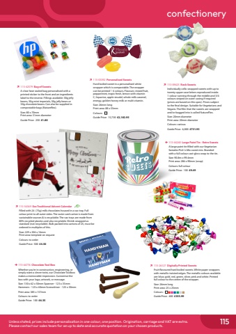 115confectioneryUnless stated, prices include personalisation in one colour, one position. Origination, carriage and VAT are extra.Please contact our sales team for an up to date and accurate quotation on your chosen products.%uf0ec%u0009115-34369 Eco Traditional Advent CalendarFilled with 24 (75g) milk chocolates housed in a vac tray. Full colour print to all outer sides. The outer card carton is made from sustainable sources & is recyclable. The vac trays are made from 80% recycled plastics and also recyclable. Shrink wrapped as standard (not recyclable). Bulk packed into cartons of 25, must be ordered in multiples of this.Size: 229 x 304 x 16mmPrint area: template on requestColours: to orderGuide Price: 500 %u00a34.50%uf0ec%u0009115-26127 Digitally Printed SweetsFruit flavoured hard boiled sweets. White paper wrappers with metallic twisted edges. The metallic colours available are: blue, gold, red, green, silver, pink and white. Printed full colour to the centre of the wrapper.Size: 26mm longPrint area: 25 x 25mmColours: %uf0a2%uf0a2%uf0a2%uf0a2%uf0a2%uf0a2%uf0a2Guide Price: 400 %u00a3355.99%uf0ec%u0009115-03392 Personalised SweetsHard boiled sweet in a personalised white wrapper which is compostable. The wrapper can be printed 1-4 colours. Flavours: mixed fruit, peppermint, tropic fresh, lemon with vitamin C, liquorice, apple strudel, whole milk caramel, energy, golden honey milk or multi vitamin.Size: 26mm longPrint area: 88 x 55mmColours: %uf0a2Guide Price: 15,750 %u00a32,182.95%uf0ec%u0009115-42579 Bag of SweetsA clear heat sealed bag personalised with a printed sticker to the front and an ingredients label to the reverse. Fillings available: 30g jelly beans, 30g mint imperials, 30g jelly bears or 30g chocolate beans. Can also be supplied in compostable bags (Natureflex).Size: 80 x 70mmPrint area: 51mm diameterGuide Price: 250 %u00a31.80%uf0ec%u0009115-09425 Rock SweetsIndividually cello wrapped sweets with up to twenty upper case letters reproduced inside. 1 colour running through the middle and 3/4 colours striped on outer casing if required (prices are based on this spec). Prices subject to the final design. Suitable for Vegetarians and Vegans. The film that the sweets are wrapped and/or bagged into is called NatureFlex.Size: 20mm diameterPrint area: 20mm diameterColours: variousGuide Price: 6,000 %u00a3731.95%uf0e8%u0009115-44776 Chocolate Tool BoxWhether you%u2019re in construction, engineering, or simply want a clever twist, our Chocolate Toolbox makes a memorable impression. Customise the box with your logo, artwork, or message.Size: 130 x 62 x 50mm Spanner - 123 x 35mm Hammers - 125 x 40mm Screwdriver - 125 x 30mmPrint area: 385 x 157mmColours: to orderGuide Price: 100 %u00a36.35%uf0e7 115-44240 Large Paint Tin - Retro SweetsA large paint tin filled with our Vegetarian Swizzles Pick%u2019 n Mix sweet mix. Branded with a full colour cast-gloss wrap to the tin.Size: 90.8m x 99.4mmPrint area: 286 x 90mm (wrap)Colours: full colourGuide Price: 100 %u00a39.49