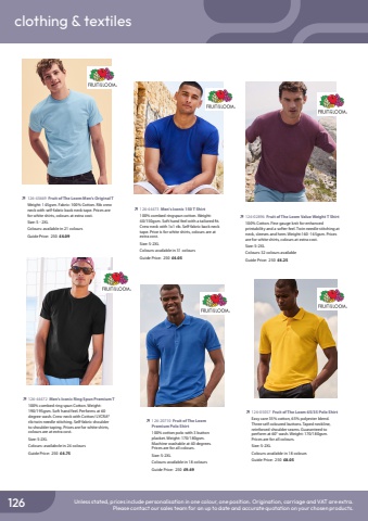 conference & exhibition clothing & textiles126 Unless stated, prices include personalisation in one colour, one position. Origination, carriage and VAT are extra.Please contact our sales team for an up to date and accurate quotation on your chosen products.%uf0ec%u0009126-02896 Fruit of The Loom Value Weight T Shirt100% Cotton. Fine gauge knit for enhanced printability and a softer feel. Twin needle stitching at neck, sleeves and hem. Weight:160 -165gsm. Prices are for white shirts, colours at extra cost.Size: S-2XLColours: 32 colours availableGuide Price: 250 %u00a34.25%uf0ec%u0009126-20710 Fruit of The Loom Premium Polo Shirt100% cotton polo with 3 button placket. Weight: 170/180gsm. Machine washable at 40 degrees. Prices are for all colours.Size: S-2XLColours: available in 18 coloursGuide Price: 250 %u00a39.49%uf0ec%u0009126-43669 Fruit of The Loom Men's Original TWeight: 145gsm. Fabric: 100% Cotton. Rib crew neck with self-fabric back neck tape. Prices are for white shirts, colours at extra cost.Size: S - 2XLColours: available in 21 coloursGuide Price: 250 %u00a34.09%uf0ec%u0009126-05057 Fruit of The Loom 65/35 Polo ShirtEasy care 35% cotton, 65% polyester blend. Three self coloured buttons. Taped neckline, reinforced shoulder seams. Guaranteed to perform at 60%u00b0 wash. Weight: 170/180gsm. Prices are for all colours.Size: S-2XLColours: available in 18 coloursGuide Price: 250 %u00a38.05%uf0ec%u0009126-44473 Men's Iconic 150 T Shirt100% combed ringspun cotton. Weight: 40/150gsm. Soft hand feel with a tailored fit. Crew neck with 1x1 rib. Self-fabric back neck tape. Price is for white shirts, colours are at extra cost.Size: S-2XLColours: available in 31 coloursGuide Price: 250 %u00a34.05%uf0ec%u0009126-44472 Men's Iconic Ring Spun Premium T100% combed ring spun Cotton. Weight: 190/195gsm. Soft hand feel. Performs at 60 degree wash. Crew neck with Cotton/ LYCRA%u00ae rib twin needle stitching. Self-fabric shoulder to shoulder taping. Prices are for white shirts, colours are at extra cost.Size: S-2XLColours: availabvle in 24 coloursGuide Price: 250 %u00a34.75