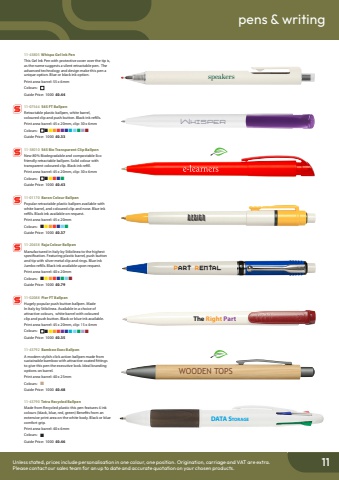 11pens & writingUnless stated, prices include personalisation in one colour, one position. Origination, carriage and VAT are extra.Please contact our sales team for an up to date and accurate quotation on your chosen products.WhisperThe Right PartDESIGNPart Rental11-38010 S45 Bio Transparent Clip BallpenNew 80% Biodegradable and compostable Eco friendly retractable ballpen. Solid colour with transparent coloured clip. Black ink refill.Print area: barrel: 45 x 20mm, clip: 30 x 6mmColours: %uf0a2%uf0a2%uf0a2%uf0a2%uf0a2%uf0a2Guide Price: 1000 %u00a30.4311-20458 Raja Colour BallpenManufactured in Italy by Stilolinea to the highest specification. Featuring plastic barrel, push button and tip with silver metal clip and rings. Blue ink Jumbo refills. Black ink available upon request.Print area: barrel: 40 x 20mmColours: %uf0a2%uf0a2%uf0a2%uf0a2%uf0a2%uf0a2%uf0a2%uf0a2Guide Price: 1000 %u00a30.7911-01170 Baron Colour BallpenPopular retractable plastic ballpen available with white barrel, and coloured clip and nose. Blue ink refills. Black ink available on request.Print area: barrel: 45 x 20mmColours: %uf0a2%uf0a2%uf0a2%uf0a2%uf0a2%uf0a2%uf0a2Guide Price: 1000 %u00a30.3711-02088 Pier FT BallpenHugely popular push button ballpen. Made In Italy by Stilolinea. Available in a choice of attractive colours, white barrel with coloured clip and push button. Black or blue ink available.Print area: barrel: 45 x 20mm, clip: 15 x 4mmColours: %uf0a2%uf0a2%uf0a2%uf0a2%uf0a2%uf0a2%uf0a2%uf0a2%uf0a2%uf0a2%uf0a2%uf0a2Guide Price: 1000 %u00a30.3511-07544 S45 FT BallpenRetractable plastic ballpen, white barrel, coloured clip and push button. Black ink refills.Print area: barrel: 45 x 20mm, clip: 30 x 6mmColours: %uf0a2%uf0a2%uf0a2%uf0a2%uf0a2%uf0a2%uf0a2%uf0a2%uf0a2%uf0a2%uf0a2%uf0a2Guide Price: 1000 %u00a30.3311-43805 Whispa Gel Ink PenThis Gel Ink Pen with protective cover over the tip is, as the name suggests a silent retractable pen. The advanced technology and design make this pen a unique option. Blue or black ink option.Print area: barrel: 55 x 6mmColours: %uf0a2Guide Price: 1000 %u00a30.44speakers11-43792 Bamboo Exec BallpenA modern stylish click action ballpen made from sustainable bamboo with attractive coated fittings to give this pen the executive look. Ideal branding options on barrel.Print area: barrel: 40 x 25mmColours: %uf0a2Guide Price: 1000 %u00a30.4811-43790 Tetra Recycled BallpenMade from Recycled plastic this pen features 4 ink colours (black, blue, red, green) Benefits from an extensive print area on the white body. Black or blue comfort grip.Print area: barrel: 40 x 6mmColours: %uf0a2Guide Price: 1000 %u00a30.46WOODEN TOPSDATA Storage