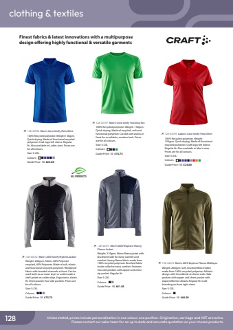 conference & exhibition clothing & textiles128 Unless stated, prices include personalisation in one colour, one position. Origination, carriage and VAT are extra.Please contact our sales team for an up to date and accurate quotation on your chosen products.%uf0ec%u0009128-43597 Men's Core Unify Training Tee100% Recycled polyester. Weight: 130gsm. Quick drying. Made of recycled, soft and functional polyester. Curved side seams at front for an athletic, modern look. Prices are for all colours.Size: S-2XLColours: %uf0a2%uf0a2%uf0a2%uf0a2Guide Price: 50 %u00a315.75%uf0ec%u0009128-43599 Ladie's Core Unify Polo Shirt100% Recycled polyester. Weight: 158gsm. Quick drying. Made of functional recycled polyester. Craft logo left sleeve. Regular fit. Also available in Men's sizes. Prices are for all colours.Size: S-2XLColours: %uf0a2%uf0a2%uf0a2%uf0a2%uf0a2%uf0a2%uf0a2%uf0a2%uf0a2Guide Price: 50 %u00a324.00Finest fabrics & latest innovations with a multipurpose design offering highly functional & versatile garments%uf0ec%u0009128-44475 Men's ADV Explore Heavy Fleece JacketWeight: 310gsm. Warm fleece jacket with brushed inside for extra warmth and comfort. Heavy fleece fabric made from 100% recycled polyester. Brushed fabric inside collar for extra comfort. Features two side pockets with zipper and chest zip pocket. Regular fit.Size: S-2XLColours: %uf0a2%uf0a2Guide Price: 50 %u00a361.85%uf0ec%u0009128-44474 Men's ADV Explore Fleece MidlayerWeight: 200gsm. Soft, brushed fleece fabric made from 100% recycled polyester. Athletic design with thumbhole at sleeve ends. Side pockets with zipper and chest pocket with zipperreflective details. Regular fit. Craft branding on front right chest.Size: S-2XLColours: %uf0a2Guide Price: 50 %u00a346.50ALL PRODUCTS%uf0ec%u0009128-43598 Men's Core Unify Polo Shirt100% Recycled polyester. Weight:158gsm. Quick drying. Made of functional recycled polyester. Craft logo left sleeve. Regular fit. Also available in Ladies sizes. Prices are for all colours.Size: S-2XLColours: %uf0a2%uf0a2%uf0a2%uf0a2%uf0a2%uf0a2Guide Price: 50 %u00a324.00%uf0ec%u0009128-43652 Men's ADV Unify Hybrid JacketWeight: 240gsm. Fabric: 60% Polyester recycled, 40% Polyester. Made of soft, elastic and functional recycled polyester. Windproof fabric with bonded channels at front. Can be used both as an outer layer or underneath a shell jacket on colder days. Ergonomic, elastic fit. Chest pocket.Two side pockets. Prices are for all colours.Size: S-2XLColours: %uf0a2%uf0a2%uf0a2Guide Price: 50 %u00a375.75
