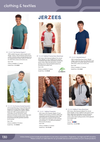 conference & exhibition clothing & textiles130 Unless stated, prices include personalisation in one colour, one position. Origination, carriage and VAT are extra.Please contact our sales team for an up to date and accurate quotation on your chosen products.%uf0ec%u0009130-44507 Eco Premium Organic T100% combed ring-spun cotton (organic yarn) Weight: 165gsm. Soft hand feel for phenomenal comfort. Smooth surface and high-density jersey for exceptional print clarity. Classic fit. Prices are for white shirts, colours are at extra cost.Size: S-2XLColours: available in 15 coloursGuide Price: 250 %u00a34.95%uf0ec%u0009130-44510 Essential Cotton T100% Combed Ring-Spun Cotton. Weight: 150gsm. Classic fit. Crew neck with elastic neck rib. Shoulder-to-shoulder taping. Prices are for white shirts, colours are at extra cost.Size: S-2XLColours: available in 15 coloursGuide Price: 250 %u00a34.62%uf0ec%u0009130-44506 Eco Premium Hooded Sweatshirt57% Combed Ring-Spun Cotton/43% Recycled Polyester Pre-shrunk Fleece. Weight: 288gsm. Cotton rich 3-end fleece for superior softness. Made with 100% recycled polyester and sustainably-sourced, USA-grown cotton. Moisture-wicking for all-day comfort. High stitch density for a smooth printing canvas. 2-ply jersey-lined hood with grommets and front pouch pocket.Size: S-2XLColours: available in 10 coloursGuide Price: 100 %u00a320.35%uf0ec%u0009130-44508 NuBlend%u00ae Colour-Block Hood50% Cotton, 50% Polyester NuBlend%u00ae Pre-shrunk Fleece. Weight: 271gsm. NuBlend%u00ae pill-resistant 2-end fleece. Made with sustainably-sourced, USA-grown cotton. High stitch density for a smooth printing canvas. Colour-block styling provides a fresh approach to an athletic style.Size: S-2XL Colours: %uf0a2%uf0a2%uf0a2%uf0a2Guide Price: 100 %u00a317.85%uf0ec%u0009130-44509 NuBlend%u00ae Varsity Colour-Block Hood50% Cotton, 50% Polyester NuBlend%u00ae Pre-shrunk Fleece, Weight: 271gsm. NuBlend%u00ae pill-resistant 2-end fleece. Made with sustainably-sourced, USAgrown cotton. High stitch density for a smooth printing canvas. Oatmeal Heather bodies for a throwback yet modern look.Size: S-2XLColours: available in 5 coloursGuide Price: 50 %u00a318.45%uf0ec%u0009130-44511 NuBlend%u00ae Sweatshirt50% Cotton/ 50% Polyester. Weight: 271gsm.NuBlend%u00ae pill-resistant 2-end fleece. Made with sustainably-sourced, USA-grown cotton. High stitch density for a smooth printing canvas. Two-needle cover stitching on neck, armholes and waistband. 1x1 rib cuffs and waistband. Prices are for all colours.Size: S-2XLColours: available in 16 coloursGuide Price: 100 %u00a311.05ALL PRODUCTS