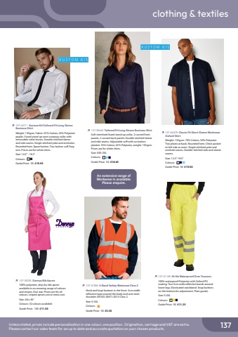 137clothing & textilesUnless stated, prices include personalisation in one colour, one position. Origination, carriage and VAT are extra.Please contact our sales team for an up to date and accurate quotation on your chosen products.%uf0ec%u0009137-43711 Kustom Kit Tailored Fit Long Sleeve Business ShirtWeight: 105gsm. Fabric: 55% Cotton, 45% Polyester poplin. Fused stand up semi-cutaway collar with removable collar bones. Double stitched sleeve and side seams. Single stitched yoke and armholes. Rounded hem. Spare button. Two button cuff. Easy iron. Prices are for white shirts.Size: 14.5\Colours: %uf0a2%uf0a2Guide Price: 50 %u00a319.95%uf0ec%u0009137-38443 Tailored Fit Long Sleeve Business ShirtSoft interlined fused stand up collar. 2 curved front panels, 2 curved back panels. Double stitched sleeve and side seams. Adjustable cuff with no button placket. 55% Cotton, 45% Polyester, weight: 105gsm. Prices are for white shirts.Size: XXS-3XL Colours: %uf0a2%uf0a2%uf0a2Guide Price: 50 %u00a318.65%uf0ec%u0009137-20703 Dennys Bib Apron100% polyester, drip dry bib apron available in an amazing range of colours and stripes. One size. Prices are for all colours, striped aprons are at extra cost.Size: 28 x 36\Colours: 32 colours availableGuide Price: 100 %u00a311.50%uf0ec%u0009137-41094 4-Band Safety Waistcoat Class 2Hook and loop fastener in the front. 5cm width reflective tape around the body and over each shoulder. EN ISO 20471:2013 Class 2.Size: S-5XL Colours: %uf0a2Guide Price: 50 %u00a33.30%uf0ec%u0009137-41100 Hi-Viz Waterproof Over Trousers100% waterproof Polyester with Oxford PU coating. Two 5cm wide reflective bands around lower legs. Elasticated waistband. Snap buttons on the bottom for adjustment. Plain goods.Size: S-3XL Colours: %uf0a2%uf0a2%uf0a2Guide Price: 50 %u00a311.25%uf0ec%u0009137-44479 Classic Fit Short Sleeve Workwear Oxford ShirtWeight: 135gsm. 70% Cotton, 30% Polyester.Two pleats at back. Rounded hem. Chest pocket to left side as worn. Single stitched yoke and armhole seams. Double stitched side and sleeve seams.Size: 13.5\Colours: %uf0a2%uf0a2%uf0a2Guide Price: 50 %u00a319.50An extensive range of Workwear is available.Please enquire.
