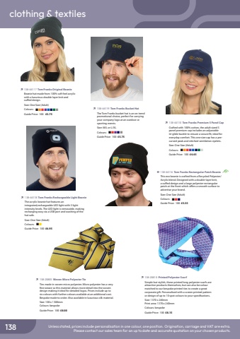 conference & exhibition clothing & textiles138 Unless stated, prices include personalisation in one colour, one position. Origination, carriage and VAT are extra.Please contact our sales team for an up to date and accurate quotation on your chosen products.%uf0ec%u0009138-44118 Tom Franks Rechargeable Light BeanieThe acrylic beanie hat features an integrated,rechargeable LED light with 3 light intensity levels. The LED light is removable, making recharging easy via a USB port and washing of the hat safe.Size: One Size (Adult) Colours: %uf0a2%uf0a2Guide Price: 100 %u00a36.95%uf0e7%u0009138-44116 Tom Franks Rectangular Patch BeanieThis eco beanie is crafted from a Recycled Polyester/Acrylic blend. Designed with a double-layer knit, a cuffed design and a large polyester rectangular patch at the front which offers a smooth surface to advertise your brand.Size: One Size (Adult) Colours: %uf0a2%uf0a2%uf0a2Guide Price: 100 %u00a35.35%uf0ec%u0009138-44110 Tom Franks Premium 5 Panel CapCrafted with 100% cotton, the adult sized 5 panel premium cap includes an adjustable tri-glide buckle to ensure a secure fit, ideal for everyday comfort. This one size cap has a precurved peak and stitched ventilation eyelets.Size: One Size (Adult) Colours: %uf0a2%uf0a2%uf0a2%uf0a2%uf0a2%uf0a2%uf0a2%uf0a2Guide Price: 100 %u00a34.45%uf0ec%u0009138-44117 Tom Franks Original BeanieBeanie hat made from 100% soft feel acrylic with a luxurious double layer knit and cuffed design.Size: One Size (Adult) Colours: %uf0a2%uf0a2%uf0a2%uf0a2%uf0a2%uf0a2%uf0a2%uf0a2Guide Price: 100 %u00a33.75%uf0ec%u0009138-44119 Tom Franks Bucket HatThe Tom Franks bucket hat is an on trend promotional choice, perfect for carrying your company logo at an outdoor or sporting events.Size: M/L or L/XL Colours: %uf0a2%uf0a2%uf0a2%uf0a2%uf0a2Guide Price: 100 %u00a35.75%uf0ec%u0009138-20810 Printed Polyester ScarfSimple but stylish, these printed long polyester scarfs are attractive products themselves, but can also be colour matched to our bespoke printed ties to create a great corporate gift. Personalised with a screen printed pattern or design of up to 10 spot colours to your specifications.Size: 1370 x 240mmPrint area: 1370 x 240mmColours: bespokeGuide Price: 100 %u00a38.15%uf0ec%u0009138-20805 Woven Micro Polyester TieTies made in woven micro polyester. Micro polyester has a very fine weave so this material allows more detail into the woven design making it ideal for detailed logos. Prices include up to six colours with further colours available at an additional cost. Bespoke made to order. Also available in luxurious silk material.Size: 100 x 1500mmColours: bespokeGuide Price: 100 %u00a38.00