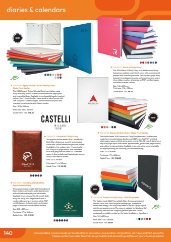 conference & exhibition diaries & calendars140 Unless stated, prices include personalisation in one colour, one position. Origination, carriage and VAT are extra.Please contact our sales team for an up to date and accurate quotation on your chosen products.%uf0ec%u0009140-44730 Appeel Ortisei Quarto Weekly Diary - Made From Apples The 2026 Appeel 'Ortisei' Weekly Diary is an Italian-made diary featuring an eco-leather cover made from apple peel and vegetable fibres. Available in ten beautiful apple-inspired colours, this 13-month diary has a week-to-view format with soft ivory FSC%u00ae certified pages, a blind-embossed year date, rounded corners and a gold ribbon marker.Size: 210 x 260mmPrint area: 130 x 225mmGuide Price: 100 %u00a314.25%uf0ec 140-44729 Oceano A4 Daily Diary - Made From Bottles The Italian-made 2026 Oceano A4 Daily Diary features a tactile cover made from recycled plastic bottles and 100% recycled FSC%u00ae certified white paper pages crafted using green energy. This 12-month diary has a day-to-a-page layout with timed appointments, perforated page corners, and a blind-embossed date. Available in six colors, the cover is suitable for digital printing, foil blocking, or blind embossing.Size: 210 x 297mmPrint area: 171 x 264mmGuide Price: 100 %u00a316.25%uf0ec%u0009140-44727 Matra A5 Daily DiaryThe 2026 Matra A5 Daily Diary is an Italian-made diary featuring a padded, matt-finish cover with an embossed pattern and silver foil year date. This day-to-a-page diary includes timed appointments, perforated corners, and a silver ribbon marker, all printed on FSC%u00ae certified paper. Available in seven colours.Size: 145 x 205mmPrint area: 114 x 136mmGuide Price: 100 %u00a36.35%uf0ec%u0009140-44728 Prisma A5 Daily Diary - 100% RecyclableThe Italian-made 2026 Prisma Daily Diary features a textured, flexible cover and 100% recycled white pages, made from renewable energy. This daily diary offers a day-to-a-page layout with timed appointments. The cover is suitable for blind and foil embossing and features a digitally printed year and a blindembossed recyclable symbol on the back. Available in six colours.Size: 145 x 205mmPrint area: 114 x 180mmGuide Price: 100 %u00a36.95%uf0e7%u0009140-44732 Colombia A5 Daily DiaryThe popular Italian-made 2026 Colombia A5 Daily Diary features a smooth, understated cover with a blind-embossed year and border. Available in five colours, this 12-month diary has a day-to-a-page format with a modern blue and grey print on white FSC%u00ae certified paper. It also includes perforated page corners and a silver ribbon marker.Size: 145 x 205mmPrint area: 114 x 180mmGuide Price: 100 %u00a35.95%uf0e8%u0009140-44731 Colombia A4 Daily MultiAppointments DiaryThe popular Italian-made 2026 Colombia A4 Diary features a smooth, understated cover with a blind-embossed year and border. Available in six colours, this 12-month daily diary has a day-to-a-page format with a modern blue and grey print on white FSC%u00ae certified paper. It also includes perforated page corners and a silver ribbon marker.Size: 210 x 297mmPrint area: 171 x 264mmGuide Price: 100 %u00a311.35NEW!NEW!NEW!