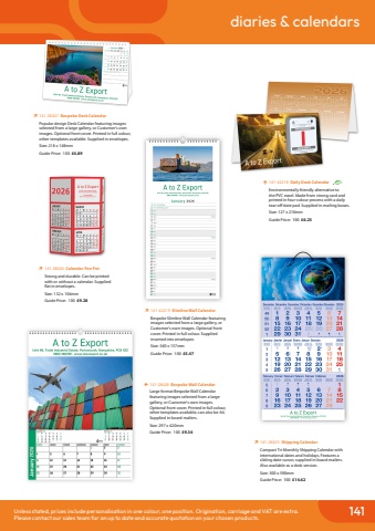 141diaries & calendarsUnless stated, prices include personalisation in one colour, one position. Origination, carriage and VAT are extra.Please contact our sales team for an up to date and accurate quotation on your chosen products.%uf0ec%u0009141-28425 Shipping CalendarCompact Tri-Monthly Shipping Calendar with international dates and holidays. Features a sliding date cursor, supplied in board mailers. Also available as a desk version.Size: 300 x 590mmGuide Price: 100 %u00a314.62%uf0ec%u0009141-28426 Calendar Pen PotStrong and durable. Can be printed with or without a calendar. Supplied flat in envelopes.Size: 132 x 104mmGuide Price: 100 %u00a39.28%uf0e7%u0009141-28428 Bespoke Wall CalendarLarge format Bespoke Wall Calendar featuring images selected from a large gallery, or Customer's own images. Optional front cover. Printed in full colour, other templates available, can also be A4. Supplied in board mailers.Size: 297 x 420mmGuide Price: 100 %u00a39.34%uf0ec%u0009141-28427 Bespoke Desk CalendarPopular design Desk Calendar featuring images selected from a large gallery, or Customer's own images. Optional front cover. Printed in full colour, other templates available. Supplied in envelopes.Size: 218 x 148mmGuide Price: 100 %u00a34.89%uf0e9%u0009141-42218 Daily Desk CalendarEnvironmentally friendly alternative to the PVC easel. Made from strong card and printed in four-colour process with a daily tear-off date pad. Supplied in mailing boxes.Size: 127 x 210mmGuide Price: 100 %u00a36.25%uf0ec%u0009141-42219 Slimline Wall CalendarBespoke Slimline Wall Calendar featuring images selected from a large gallery, or Customer's own images. Optional front cover. Printed in full colour. Supplied inserted into envelopesSize: 340 x 157mmGuide Price: 100 %u00a35.47