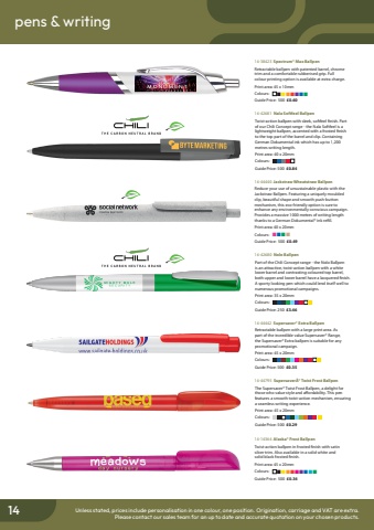 conference & exhibition pens & writing14 Unless stated, prices include personalisation in one colour, one position. Origination, carriage and VAT are extra.Please contact our sales team for an up to date and accurate quotation on your chosen products.14-38423 Spectrum%u00ae Max BallpenRetractable ballpen with patented barrel, chrome trim and a comfortable rubberised grip. Full colour printing option is available at extra charge.Print area: 45 x 10mmColours: %uf0a2%uf0a2%uf0a2%uf0a2%uf0a2%uf0a2%uf0a2%uf0a2Guide Price: 500 %u00a30.6014-14364 Alaska%u00ae Frost BallpenTwist-action ballpen in frosted finish with satin silver trim. Also available in a solid white and solid black frosted finish.Print area: 45 x 20mmColours: %uf0a2%uf0a2%uf0a2%uf0a2%uf0a2%uf0a2%uf0a2%uf0a2%uf0a2%uf0a2Guide Price: 500 %u00a30.3414-44440 Jackstraw Wheatstraw BallpenReduce your use of unsustainable plastic with the Jackstraw Ballpen. Featuring a uniquely moulded clip, beautiful shape and smooth push-button mechanism, this eco-friendly option is sure to enhance any environmentally conscious campaign. Provides a massive 1000 metres of writing length thanks to a German Dokumental%u00ae ink refill.Print area: 40 x 20mmColours: %uf0a2%uf0a2%uf0a2%uf0a2Guide Price: 500 %u00a30.4914-42681 Nala Softfeel BallpenTwist-action ballpen with sleek, softfeel finish. Part of our Chili Concept range - the Nala Softfeel is a lightweight ballpen, accented with a frosted finish to the top part of the barrel and clip. Containing German Dokumental ink which has up to 1,200 metres writing length.Print area: 40 x 20mmColours: Guide Price: 500 %u00a30.8414-42680 Nolo BallpenPart of the Chili Concept range - the Nolo Ballpen is an attractive, twist-action ballpen with a white lower barrel and contrasting coloured top barrel, both upper and lower barrel have a lacquered finish. A sporty looking pen which could lend itself well to numerous promotional campaigns.Print area: 35 x 20mmColours: Guide Price: 250 %u00a33.4614-44442 Supersaver%u00ae Extra BallpenRetractable ballpen with a large print area. As part of the incredible value Supersaver%u00ae Range, the Supersaver%u00ae Extra ballpen is suitable for any promotional campaign.Print area: 45 x 20mmColours: Guide Price: 500 %u00a30.3514-44795 Supersaver%u00c2%u00ae Twist Frost BallpenThe Supersaver%u00ae Twist Frost Ballpen, a delight for those who value style and affordability. This pen features a smooth twist-action mechanism, ensuring a seamless writing experience.Print area: 45 x 20mmColours: Guide Price: 500 %u00a30.29