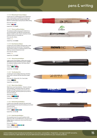 15pens & writingUnless stated, prices include personalisation in one colour, one position. Origination, carriage and VAT are extra.Please contact our sales team for an up to date and accurate quotation on your chosen products.15-43239 Wheat Quad 4 Colour BallpenA great twist on a traditional favourite! Crafted from a mix of wheat plastic and ABS this innovative pen features four ink colours for versatile writing. Also features a comfort grip to ease pressure whilst writing. Print area: 40 x 7mmColours: %uf0a2%uf0a2%uf0a2%uf0a2Guide Price: 250 %u00a30.6715-44074 Koda Recycled BallpenThe recycled version of a much loved best seller. Made from 78% recycled ABS plastic, this push action ballpen features a great print area to both the barrel and the clip. Print area: 50 x 20mmColours: %uf0a2%uf0a2%uf0a2%uf0a2%uf0a2%uf0a2%uf0a2%uf0a2%uf0a2%uf0a2%uf0a2Guide Price: 250 %u00a30.5815-44053 Refresh Recycled BallpenA stylish and sustainable metal pen that gives back. With recycled aluminium barrel including a pre-printed recycled symbol. Print area: 50 x 20mmColours: %uf0a2%uf0a2%uf0a2%uf0a2%uf0a2%uf0a2%uf0a2%uf0a2%uf0a2Guide Price: 250 %u00a31.3815-40737 Phone-up Wheat BallpenThe ultimate multifunctional pen! Crafted from a mix of wheat plastic and ABS this innovative pen features a built-in screen cleaner and phone stand, making it perfect for everyday use.Print area: 40 x 20mmColours: Guide Price: 250 %u00a30.6215-40738 Beck Bamboo BallpenA stylish push action ballpen designed with a sleek bamboo barrel and chrome trims. The bamboo barrel reduces reliance on traditional plastics while offering a natural and premium look.Print area: 50 x 20mmColours: Guide Price: 250 %u00a30.9715-44811 Glossy Recycled BallpenA glossy push action ballpen crafted with recycled ABS barrel and clip with bamboo pusher. Available in a selection of glossy colours. Ink Colour: BlackPrint area: 45 x 20 mmColours: Guide Price: 250 %u00a30.6215-44051 Tian Bamboo PenA stylish push action ballpen featuring a bamboo barrel with a coloured soft feel aluminium upper barrel.Print area: 45 x 20mm (ILC), 55 x 7mm (side)Colours: Guide Price: 250 %u00a31.1015-44812 Wave Colour BallpenMade from ocean-bound plastic. It boasts a vibrant coloured barrel, contrasting white trim, bamboo plunger, and offers a spacious print area for your brand's message! Recycled symbols pre-printed to the back of the pen.Print area: 50 x 20mmColours: Guide Price: 250 %u00a30.67ALL PRODUCTS
