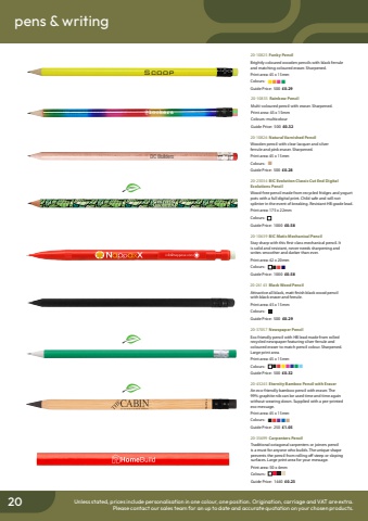 conference & exhibition pens & writing20 Unless stated, prices include personalisation in one colour, one position. Origination, carriage and VAT are extra.Please contact our sales team for an up to date and accurate quotation on your chosen products.20-10835 Rainbow PencilMulti-coloured pencil with eraser. Sharpened.Print area: 45 x 15mmColours: multicolourGuide Price: 500 %u00a30.3220-10825 Funky PencilBrightly coloured wooden pencils with black ferrule and matching coloured eraser. Sharpened.Print area: 45 x 15mmColours: %uf0a2%uf0a2%uf0a2%uf0a2Guide Price: 500 %u00a30.2920-10826 Natural Varnished PencilWooden pencil with clear lacquer and silver ferrule and pink eraser. Sharpened.Print area: 45 x 15mmColours: %uf0a2Guide Price: 500 %u00a30.28DC BuildersScoop@lockers20-10639 BIC Matic Mechanical PencilStay sharp with this first-class mechanical pencil. It is solid and resistant, never needs sharpening and writes smoother and darker than ever.Print area: 42 x 20mmColours: %uf0a2%uf0a2%uf0a2%uf0a2Guide Price: 1000 %u00a30.5820-23034 BIC Evolution Classic Cut End Digital Ecolutions PencilWood-free pencil made from recycled fridges and yogurt pots with a full digital print. Child safe and will not splinter in the event of breaking. Resistant HB grade lead. Print area: 175 x 22mmColours: %uf0a2Guide Price: 1000 %u00a30.5820-37057 Newspaper PencilEco friendly pencil with HB lead made from rolled recycled newspaper featuring silver ferrule and coloured eraser to match pencil colour. Sharpened. Large print area. Print area: 45 x 15mmColours: %uf0a2%uf0a2%uf0a2%uf0a2%uf0a2%uf0a2%uf0a2%uf0a2Guide Price: 500 %u00a30.3220-43245 Eternity Bamboo Pencil with EraserAn eco-friendly bamboo pencil with eraser. The 99% graphite nib can be used time and time again without wearing down. Supplied with a pre-printed eco message.Print area: 45 x 15mmColours: %uf0a2%uf0a2%uf0a2%uf0a2%uf0a2Guide Price: 250 %u00a31.0520-35699 Carpenters PencilTraditional octagonal carpenters or joiners pencil is a must for anyone who builds. The unique shape prevents the pencil from rolling off steep or sloping surfaces. Large print area for your message.Print area: 50 x 4mmColours: Guide Price: 1440 %u00a30.2320-26143 Black Wood PencilAttractive all black, matt finish black wood pencil with black eraser and ferrule.Print area: 45 x 15mmColours: Guide Price: 500 %u00a30.29