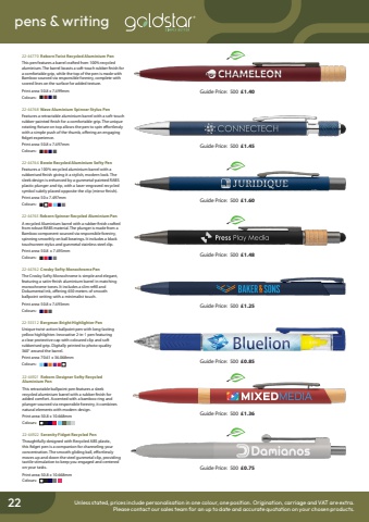 conference & exhibition pens & writing22 Unless stated, prices include personalisation in one colour, one position. Origination, carriage and VAT are extra.Please contact our sales team for an up to date and accurate quotation on your chosen products.22-44768 Wave Aluminium Spinner Stylus PenFeatures a retractable aluminium barrel with a soft-touch rubber-painted finish for a comfortable grip. The unique rotating fixture on top allows the pen to spin effortlessly with a simple push of the thumb, offering an engaging fidget experience. Print area: 50.8 x 7.497mmColours: %uf0a2%uf0a2%uf0a2%uf0a2Guide Price: 500 %u00a31.6022-44764 Bowie Recycled Aluminium Softy PenFeatures a 100% recycled aluminium barrel with a rubberised finish giving it a stylish, modern look. The sleek design is enhanced by a gunmetal-painted RABS plastic plunger and tip, with a laser-engraved recycled symbol subtly placed opposite the clip (mirror finish). Print area: 50 x 7.497mmColours: %uf0a2%uf0a2%uf0a2%uf0a2%uf0a2%uf0a222-44763 Reborn Spinner Recycled Aluminium PenA recycled Aluminium barrel with a rubber finish crafted from robust RABS material. The plunger is made from a Bamboo component sourced via responsible forestry, spinning smoothly on ball bearings. It includes a black touchscreen stylus and gunmetal stainless steel clip. Print area: 50.8 x 7.493mmColours: %uf0a2%uf0a2%uf0a2%uf0a2 Guide Price: 500 %u00a31.4822-35512 Bergman Bright Highlighter PenUnique twist-action ballpoint pen with long-lasting yellow highlighter. Innovative 2-in-1 pen featuring a clear protective cap with coloured clip and soft rubberised grip. Digitally printed to photo-quality 360%u00b0 around the barrel. Print area: 70.61 x 36.068mmColours: %uf0a2%uf0a2%uf0a2%uf0a2%uf0a2%uf0a2 Guide Price: 500 %u00a30.85Guide Price: 500 %u00a31.45Guide Price: 500 %u00a31.2522-44770 Reborn Twist Recycled Aluminium PenThis pen features a barrel crafted from 100% recycled aluminium. The barrel boasts a soft-touch rubber finish for a comfortable grip, while the top of the pen is made with Bamboo sourced via responsible forestry, complete with scored lines on the surface for added texture. Print area: 50.8 x 7.499mmColours: %uf0a2%uf0a2%uf0a2%uf0a2Guide Price: 500 %u00a31.4022-44762 Crosby Softy Monochrome PenThe Crosby Softy Monochrome is simple and elegant, featuring a satin-finish aluminium barrel in matching monochrome tones. It includes a slim refill and Dokumental ink, offering 650 meters of smooth ballpoint writing with a minimalist touch. Print area: 50.8 x 7.493mmColours: %uf0a2%uf0a2%uf0a2Guide Price: 500 %u00a31.36Guide Price: 500 %u00a30.7522-44921 Reborn Designer Softy Recycled Aluminium PenThis retractable ballpoint pen features a sleek recycled aluminium barrel with a rubber finish for added comfort. Accented with a bamboo ring and plunger sourced via responsible forestry, it combines natural elements with modern design. Print area: 50.8 x 10.668mmColours: 22-44922 Serenity Fidget Recycled PenThoughtfully designed with Recycled ABS plastic, this fidget pen is a companion for channeling your concentration. The smooth gliding ball, effortlessly moves up and down the steel gunmetal clip, providing tactile stimulation to keep you engaged and centered on your tasks. Print area: 50.8 x 10.668mmColours: