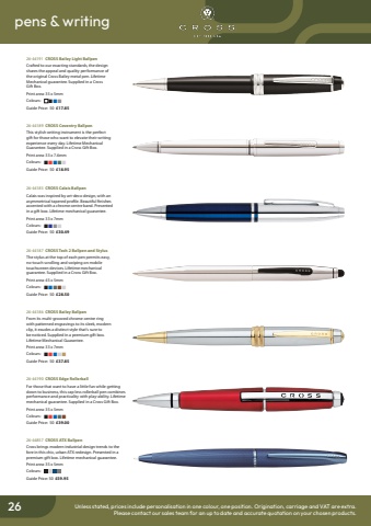 conference & exhibition pens & writing26 Unless stated, prices include personalisation in one colour, one position. Origination, carriage and VAT are extra.Please contact our sales team for an up to date and accurate quotation on your chosen products.26-44186 CROSS Bailey BallpenFrom its multi-grooved chrome centre ring with patterned engravings to its sleek, modern clip, it exudes a distinct style that's sure to be noticed. Supplied in a premium gift box. Lifetime Mechanical Guarantee. Print area: 33 x 7mmColours: %uf0a2%uf0a2%uf0a2%uf0a2%uf0a2Guide Price: 50 %u00a337.8526-44185 CROSS Calais BallpenCalais was inspired by art-deco design, with an asymmetrical tapered profile. Beautiful finishes accented with a chrome centre band. Presented in a gift box. Lifetime mechanical guarantee. Print area: 33 x 7mmColours: %uf0a2%uf0a2%uf0a2%uf0a2Guide Price: 50 %u00a330.4926-44189 CROSS Coventry BallpenThis stylish writing instrument is the perfect gift for those who want to elevate their writing experience every day. Lifetime Mechanical Guarantee. Supplied in a Cross Gift Box. Print area: 33 x 7.6mmColours: %uf0a2%uf0a2%uf0a2%uf0a2%uf0a2Guide Price: 50 %u00a318.9526-44190 CROSS Edge RollerballFor those that want to have a little fun while getting down to business, this cap less rollerball pen combines performance and practicality with play-ability. Lifetime mechanical guarantee. Supplied in a Cross Gift Box. Print area: 35 x 5mmColours: %uf0a2%uf0a2%uf0a2%uf0a2%uf0a2Guide Price: 50 %u00a339.0026-44187 CROSS Tech 2 Ballpen and StylusThe stylus at the top of each pen permits easy, no-touch scrolling and swiping on mobile touchscreen devices. Lifetime mechanical guarantee. Supplied in a Cross Gift Box. Print area: 45 x 5mmColours: %uf0a2%uf0a2%uf0a2%uf0a2%uf0a2Guide Price: 50 %u00a328.5026-44191 CROSS Bailey Light BallpenCrafted to our exacting standards, the design shares the appeal and quality performance of the original Cross Bailey metal pen. Lifetime Mechanical guarantee. Supplied in a Cross Gift Box. Print area: 35 x 5mmColours: %uf0a2%uf0a2%uf0a2%uf0a2Guide Price: 50 %u00a317.8526-44857 CROSS ATX BallpenCross brings modern industrial design trends to the fore in this chic, urban ATX redesign. Presented in a premium gift box. Lifetime mechanical guarantee.Print area: 35 x 5mmColours: Guide Price: 50 %u00a359.95