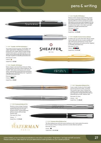 27pens & writingUnless stated, prices include personalisation in one colour, one position. Origination, carriage and VAT are extra.Please contact our sales team for an up to date and accurate quotation on your chosen products.lfrATERMAN PAR I S 27-18688 Graduate Ballpoint PenBased on a classic design, Graduate is resolutely functional and modern. Ideal for everyday use or for gift giving occasions. Includes Waterman gift box and pen refill/cartridge. Stainless steel.Print area: 50 x 15mmColours: %uf0a2Guide Price: 25 %u00a316.4027-18687 H%u00e9misph%u00e8re Ballpoint PenA pure, simple, timeless line. Both highly practical and discreet. Slides, unnoticed, into a pocket, bag or diary. A design that combines natural, seductive elegance with true magnetism. Includes Waterman gift box. Delivered with one refill. Stainless steel. Print area: 35 x 5mmColours:Guide Price: 25 %u00a364.4527-32302 Graduate Allure Ballpoint PenThe Allure ballpoint pen with twist action mechanism suits a wide variety of occasions, from everyday writing to making a statement. Incudes. Waterman gift box. Print area: 45 x 5mmColours: %uf0a2Guide Price: 100 %u00a317.6327-44860 Sheaffer VFM BallpenEmbrace modern design topped off with a simple push-button propel/repel mechanism. VFM%u2019s sleek, tapered profile has an almost aerodynamic quality that stands out even more when wrapped in its cool and contemporary finish colours. Carry it to express a creative sense of style. It also makes a great gift. Supplied in a Sheaffer presentation box. Print area: 35 x 5mmColours: Guide Price: 50 %u00a315.0927-44859 Sheaffer Sentinel Colours BallpenA modern spin on a retro click. Show off your unique sense of style with the retro modern clickable pen with a flair for the contemporary. Its slim, classic design is understated, yet creative and fun. Supplied in a Sheaffer presentation box.Print area: 35 x 5mmColours: Guide Price: 50 %u00a311.6927-44861 Sheaffer 100 PVD Gold BallpenThe modern tool for Inspiration. The Sheaffer%u00ae 100 makes a great gift for celebrating an occasion or kicking off a new chapter. With its modern design, timeless finish options, and balanced feel, it is the perfect tool for letting ideas flow effortlessly onto the page. Supplied in a Sheaffer presentation box.Print area: 35 x 5mmColours: Guide Price: %u00a337.0027-44862 Sheaffer 300 BallpenRobust, elegant, and everything in between. Make a big impression with every creative endeavour. The Sheaffer%u00ae 300 is ultra-contemporary with a broad stance, wide polished centre band and a perforated clip featuring the SHEAFFER White Dot%u00ae. Supplied in a Sheaffer presentation box.Print area: 35 x 5mmColours: Guide Price: %u00a333.85