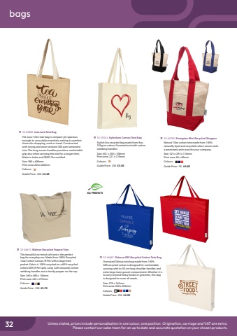 conference & exhibition bags32 Unless stated, prices include personalisation in one colour, one position. Origination, carriage and VAT are extra.Please contact our sales team for an up to date and accurate quotation on your chosen products.%uf0ec%u000932-35542 Aylesham Canvas Tote BagStylish Eco recycled bag made from 8oz, 225gsm cotton. Gusseted and with cotton webbing handles.Size: 401 x 350 x 100mmPrint area: 221 x 210mmColours: %uf0a2Guide Price: 250 %u00a33.05%uf0ec%u000932-44469 Juta Jute Tote BagThe Juta 7 litre tote bag is compact yet spacious enough to carry daily essentials, making it a perfect choice for shopping, work or travel. Constructed with strong and wear-resistant 300 gsm laminated Jute. The long woven handles provide a comfortable grip also when carrying the tote for a longer time. Made in India and OEKO-Tex certified.Size: 380 x 400mmPrint area: 260 x 280mmColours: %uf0a2Guide Price: 250 %u00a33.29ALL PRODUCTS%uf0ec%u000932-44782 Rivington Mini Recycled ShopperNatural 10oz cotton tote made from 100% naturally dyed and recycled cotton canvas with a prominent print area for your company.Size: 325 x 293 x 150mmPrint area: 60 x 60mmColours: %uf0a2%uf0a2%uf0a2Guide Price: 50 %u00a34.85%uf0ec%u000932-44615 Walmer Recycled Popper ToteThis beautiful on-trend soft tote is the perfect bag for everyday use. Made from 100% Recycled 12oz Cotton Canvas /R-Pet with a large front pocket. Fabric is 100% recycled on a 60% recycled cotton/40% R-Pet split. Long (self coloured) cotton webbing handles and a handy popper on the top.Size: 360 x 480 x 140mmPrint area: 245 x 275mmColours: %uf0a2%uf0a2%uf0a2Guide Price: 250 %u00a35.75%uf0ec%u000932-44467 Odessa GRS Recycled Cotton Tote BagOversized Odessa tote bag made from 100% GRS recycled cotton is designed for comfortable carrying with its 30 cm long shoulder handles and extra large main gusset compartment. Whether it is to carry around heavy books or groceries, this bag is designed to cover all needs.Size: 570 x 165mmPrint area: 300 x 300mmColours: %uf0a2%uf0a2%uf0a2%uf0a2%uf0a2%uf0a2Guide Price: 250 %u00a34.95