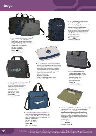 conference & exhibition bags36 Unless stated, prices include personalisation in one colour, one position. Origination, carriage and VAT are extra.Please contact our sales team for an up to date and accurate quotation on your chosen products.%uf0ec%u000936-38093 Chillenden rPET Business BagEco quality laptop business bag made from Reach compliant 300 x 300D rPET. Padded compartment for laptops, adjustable shoulder strap and neoprene wrap carry handles.Size: 365 x 220 x 105mmPrint area: 200 x 160mmColours: %uf0a2%uf0a2Guide Price: 100 %u00a312.20%uf0ec%u000936-40864 Bickley Recycled Document BagReach compliant recycled conference/meeting bag made from 300 x 300D rPET (recycled plastic bottles) fabric. With a zipped front pocket, carry handle and adjustable shoulder strap.Size: 400 x 325 x 80mmPrint area: 225 x 120mmColours: %uf0a2%uf0a2Guide Price: 100 %u00a38.50%uf0ec%u000936-43516 Westerham Recycled PC BagPC Bag made from 600 x 600D rPET fabric, padded laptop compartment for a 15.4\interior 210D rPET with mesh accessory and zipped organisational pockets, carry handles and shoulder strap. Front slip pocket.Size: 280 x 375 x 25mmPrint area: 180 x 230mmColours: %uf0a2%uf0a2%uf0a2Guide Price: 100 %u00a311.95%uf0ec%u000936-42447 Neoprene Zipped 13\Protective zipped sleeve in sturdy 3mm neoprene with optional furry lining. Comes as standard with a black rectangular moulded soft PVC zip pull. Option for bespoke moulded soft PVC zip pulls also available as well as other personalisation options. Available in a variety of sizes.Size: 330 x 260 x 30mmPrint area: 250 x 180mmColours: wide range of standard coloursGuide Price: 250 %u00a39.30%uf0ec%u000936-44299 Odessa Laptop BagPolyester bag with a large zipped compartment suitable for a 15 inch laptop, a front zipped pocket and adjustable shoulder strap.Size: 290 x 280 x 30mmPrint area: 140 x 70mmColours: %uf0a2Guide Price: 50 %u00a310.76%uf0ec%u000936-44463 Joey 14\Composed with highly durable and sustainable materials, GRS recycled canvas and GRS rPET lining, the Joey 14\laptop sleeve features a protected laptop compartment, and an open front pocket with hook and loop closure. The decorative metal plate can make a logo shine through its subtle and matt finish. 80% GRS certified recycled cotton and 20% Cotton, 330gsm.Size: 385 x 265mmPrint area: 38 x 12mmColours: %uf0a2%uf0a2%uf0a2%uf0a2Guide Price: 50 %u00a311.79%uf0eb%u000936-44625 Westerham Everyday Recycled Laptop BackpackPremium Backpack styled for work or leisure is made from 600 x 600D R-Pet fabric with bungee cord detailing, padded laptop compartment for 15.4 PC , interior accessory & organizational zip pockets, dual elasticated side pockets and adjustable padded straps with reflective accents to front and rear.Size: 440 x 280 x 140mmPrint area: 135 x 135mmColours: %uf0a2%uf0a2%uf0a2Guide Price: 250 %u00a319.95