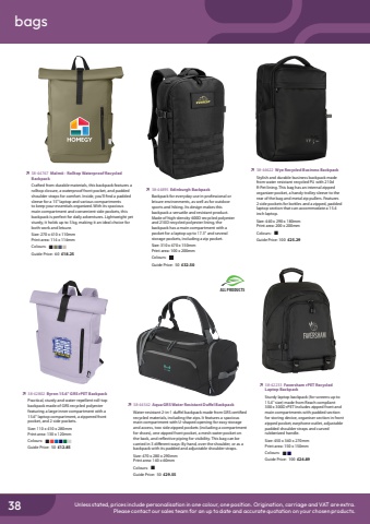conference & exhibition bags38 Unless stated, prices include personalisation in one colour, one position. Origination, carriage and VAT are extra.Please contact our sales team for an up to date and accurate quotation on your chosen products.%uf0ec%u000938-42233 Faversham rPET Recycled Laptop BackpackSturdy laptop backpack (for screens up to 15.4'' size) made from Reach compliant 300 x 300D rPET Includes zipped front and main compartments with padded section for storing device, organiser section in front zipped pocket, earphone outlet, adjustable padded shoulder straps and curved rubberized handle.Size: 450 x 340 x 270mmPrint area: 150 x 150mmColours: %uf0a2%uf0a2Guide Price: 100 %u00a324.89%uf0ec%u000938-42802 Byron 15.6'' GRS rPET BackpackPractical, sturdy and water-repellent roll-top backpack made of GRS recycled polyester featuring a large inner compartment with a 15.6\pocket, and 2 side pockets.Size: 110 x 410 x 280mmPrint area: 130 x 120mmColours: %uf0a2%uf0a2%uf0a2%uf0a2%uf0a2%uf0a2Guide Price: 50 %u00a312.85%uf0ec%u000938-44542 Aqua GRS Water Resistant Duffel BackpackWater-resistant 2-in-1 duffel backpack made from GRS certified recycled materials, including the zips. It features a spacious main compartment with U-shaped opening for easy storage and access, two side zipped pockets (including a compartment for shoes), one zipped front pocket, a mesh water pocket on the back, and reflective piping for visibility. This bag can be carried in 3 different ways: By hand, over the shoulder, or as a backpack with its padded and adjustable shoulder straps.Size: 470 x 280 x 290mmPrint area: 140 x 60mmColours: %uf0a2Guide Price: 50 %u00a329.55%uf0ec%u000938-44622 Wye Recycled Business BackpackStylish and durable business backpack made from water resistant recycled PU with 210d R-Pet lining. This bag has an internal zipped organizer pocket, a handy trolley sleeve to the rear of the bag and metal zip pullers. Features 2 side pockets for bottles and a zipped, padded laptop section that can accommodate a 15.4 inch laptop.Size: 440 x 290 x 180mmPrint area: 200 x 200mmColours: %uf0a2Guide Price: 100 %u00a325.29%uf0ec%u000938-44767 Malm%u00f6 - Rolltop Waterproof Recycled BackpackCrafted from durable materials, this backpack features a rolltop closure, a waterproof front pocket, and padded shoulder straps for comfort. Inside, you'll find a padded sleeve for a 15\to keep your essentials organized. With its spacious main compartment and convenient side pockets, this backpack is perfect for daily adventures. Lightweight yet sturdy, it holds up to 5 kg, making it an ideal choice for both work and leisure.Size: 270 x 410 x 110mmPrint area: 114 x 114mmColours: %uf0a2%uf0a2%uf0a2%uf0a2Guide Price: 60 %u00a318.25%uf0ec%u000938-44895 Edinburgh BackpackBackpack for everyday use in professional or leisure environments, as well as for outdoor sports and hiking. Its design makes this backpack a versatile and resistant product. Made of high-density 600D recycled polyester and 210D recycled polyester lining, the backpack has a main compartment with a pocket for a laptop up to 17.3\storage pockets, including a zip pocket.Size: 310 x 470 x 150mmPrint area: 100 x 200mmColours: Guide Price: 50 %u00a332.50ALL PRODUCTS