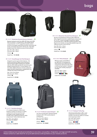 39bagsUnless stated, prices include personalisation in one colour, one position. Origination, carriage and VAT are extra.Please contact our sales team for an up to date and accurate quotation on your chosen products.%uf0ec%u000939-42670 Re Boston Laptop BackpackTwo Tone recycled nylon waterproof laptop backpack with 210D recycled polyester compartment.Size: 310 x 470 x 200mmPrint area: 150 x 100mmColours: %uf0a2%uf0a2%uf0a2Guide Price: 100 %u00a338.85%uf0ec%u000939-43517 Westerham Recycled Business BackpackBusiness backpack made from 600D rPET fabric with 300D rPET PU contrasts. 3 compartments, with padded laptop compartment for 15.4\accessory and zipped organizational pockets, elasticated side pocket, and zipped side pocket with key tidy. Adjustable padded straps with reflective accents to front and back.Size: 420 x 290 x 140mm Print area: 200 x 130mmColours: %uf0a2Guide Price: 100 %u00a323.80%uf0ec%u000939-43518 Westerham Recycled Travel BackpackBusiness Travel Backpack made from 600 x 600D rPET fabric, Zipped front pocket, padded laptop compartment for 15.4\mesh pocket and 3 x 210D rPET packing/organizer cubes. Bag has carry handles and adjustable padded straps with reflective accents to front and rear.Size: 500 x 301 x 125mm Print area: 300 x 140mmColours: %uf0a2Guide Price: 100 %u00a334.85%uf0ec%u000939-43707 Stockholm Backpack15\Polyester. Includes one internal 15\compartment and one main front part with zipper pocket. Padded back and shoulder straps. Additional pocket for Tablet compartment. Trolley holder back side.Size: 300 x 140 x 450mm Print area: 50 x 200mmColours: %uf0a2%uf0a2Guide Price: 50 %u00a325.75%uf0ec%u000939-44470 Budapest Trolley Bag20 inch hard-shell trolley in ABS. 1 main compartment and inner compartment. Includes a security lock. Rides on 4 wheels. Laser engraving on label.Size: 340 x 200 x 470mmPrint area: 50 x 10mmColours: %uf0a2%uf0a2%uf0a2%uf0a2%uf0a2Guide Price: 50 %u00a347.85%uf0e8 39-44863 Vilnius BackpackEfficiency meets sustainability in our 300 D rPET 18L backpack. Its lateral pocket and a zippered front compartment add functionality. With a reinforced top handle, it's designed for easy urban mobility, keeping its durability.Size: 310 x 460 x 110mmPrint area: 180 x 180mmColours: Guide Price: 50 %u00a317.85%uf0e8 39-44874 BrandCharger Anti-Theft BackpackDesigned to protect against theft, it features TSA lock for securing your zippers and a74 lug lock to attach the bag to objects, keeping your valuables safe. Also offers hidden pockets for convenience, plus padded compartments for a 15.6 inch laptop, a 10 inch tablet. Additional features include a waterproof zipper, anti-theft compartments, a padded back, and a buckle with a built-in bottle opener.Size: 120 x 310 x 410mmPrint area: 70 x 130mmColours: Guide Price: 10 %u00a375.00