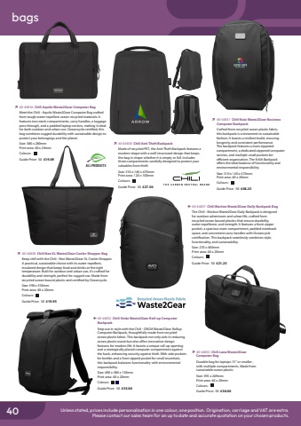 conference & exhibition bags40 Unless stated, prices include personalisation in one colour, one position. Origination, carriage and VAT are extra.Please contact our sales team for an up to date and accurate quotation on your chosen products.%uf0ec%u000940-44836 Chili Aquilo Waste2Gear Computer BagMeet the Chili - Aquilo Waste2Gear Computer Bag crafted from tough water-repellent ocean-recycled materials. It features two mesh compartments, carry handles, a luggage pass-through, and a padded laptop section, making it ideal for both outdoor and urban use. Oceancycle certified, this bag combines rugged durability with sustainable design to protect your belongings and the planet.Size: 380 x 280mmPrint area: 40 x 20mmColours: Guide Price: 50 %u00a319.09%uf0ec%u000940-44830 Chili Anti Theft BackpackMade of recycled PET, the Anti-Theft Backpack features a modern shape with a well-structured design that keeps the bag in shape whether it is empty or full. Includes three compartments carefully designed to protect your valuables from theft.Size: 310 x 140 x 470mmPrint area: 120 x 100mmColours: Guide Price: 50 %u00a327.50%uf0ec%u000940-44831 Chili Naia Waste2Gear Business Computer BackpackCrafted from recycled ocean plastic fabric, this backpack is a testament to sustainable fashion. It boasts a resilient build, ensuring longevity and consistent performance. The backpack features a main zippered compartment, a dedicated zippered computer section, and multiple small pockets for efficient organisation. The NAIA Backpack offers the ideal balance of functionality and environmental responsibility.Size: 310 x 140 x 470mmPrint area: 40 x 20mmColours: Guide Price: 50 %u00a348.25%uf0e7%u000940-44837 Chili Marlow Waste2Gear Daily Backpack BagThe Chili - Marlow Waste2Gear Daily Backpack is designed for outdoor adventures and urban life, crafted from recycled ocean bound plastics that ensure durability, water-repellence, and strength. It features a front zipper pocket, a spacious main compartment, padded notebook space, and convenient carry handles with Oceancycle certification. This backpack seamlessly combines style, functionality, and sustainability.Size: 270 x 400mmPrint area: 40 x 20mmColours: Guide Price: 50 %u00a321.25%uf0ec%u000940-44838 Chili Neo XL Waste2Gear Cooler Shopper BagKeep chill with the Chili - Neo Waste2Gear XL Cooler Shopper. A practical, sustainable choice with its water-repellent, insulated design that keeps food and drinks at the right temperature. Built for outdoor and urban use, it's crafted for durability and strength, perfect for rugged use. Made from recycled ocean-bound plastic and certified by Oceancycle.Size: 590 x 350mmPrint area: 40 x 20mmColours: Guide Price: 50 %u00a319.95%uf0ec%u000940-44833 Chili Lana Waste2Gear Computer BagDurable bag for laptops 15\with multiple compartments. Made from sustainable ocean plastic.Size: 395 x 269mmPrint area: 40 x 20mmColours: Guide Price: 50 %u00a330.00%uf0e7 40-44832 Chili Onda Waste2Gear Roll-up Computer Backpack Step out in style with the Chili - ONDA Waste2Gear Rollup Computer Backpack, thoughtfully made from recycled ocean plastic fabric. This backpack not only aids in reducing ocean plastic waste but also offers innovative design features for modern life. It boasts a unique roll-up opening and a strategically placed computer compartment against the back, enhancing security against theft. With side pockets for bottles and a front zipped pocket for small essentials, this backpack balances functionality with environmental responsibility.Size: 490 x 380 x 130mmPrint area: 40 x 20mmColours: Guide Price: 50 %u00a335.00ALL PRODUCTS