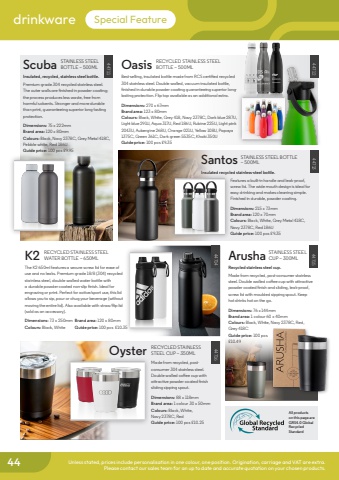 conference & exhibition drinkware44 Unless stated, prices include personalisation in one colour, one position. Origination, carriage and VAT are extra.Please contact our sales team for an up to date and accurate quotation on your chosen products.Special FeatureScuba Insulated, recycled, stainless steel bottle.Premium grade 304 recycled stainless steel. The outer walls are finished in powder coating; the process produces less waste, free from harmful solvents. Stronger and more durable than print, guaranteeing superior long-lasting protection.Dimensions: 75 x 222mmBrand area: 120 x 80mm Colours: Black, Navy 2378C, Grey Metal 418C, Pebble white, Red 186UGuide price: 100 pcs %u00a39.95Arusha Recycled stainless steel cup.Made from recycled, post-consumer stainless steel. Double walled coffee cup with attractive powder coated finish and sliding, leak-proof, screw lid with moulded sipping spout. Keep hot drinks hot on the go.Dimensions: 76 x 144mmBrand area: 1 colour 60 x 40mm Colours: Black, White, Navy 2378C, Red, Grey 418CGuide price: 100 pcs %u00a310.49Santos Insulated recycled stainless-steel bottle.Features a built-in handle and leak-proof, screw lid. The wide mouth design is ideal for easy drinking and makes cleaning simple. Finished in durable, powder coating.Dimensions: 215 x 73mmBrand area: 120 x 70mm Colours: Black, White, Grey Metal 418C, Navy 2378C, Red 186UGuide price: 100 pcs %u00a39.35Oyster Made from recycled, postconsumer 304 stainless steel. Double walled coffee cup with attractive powder coated finish sliding sipping spout.Dimensions: 88 x 118mmBrand area: 1 colour 30 x 50mm Colours: Black, White, Navy 2378C, RedGuide price: 100 pcs %u00a310.25Oasis Best-selling, insulated bottle made from RCS certified recycled 304 stainless steel. Double walled, vacuum insulated bottle, finished in durable powder coating guaranteeing superior longlasting protection. Flip top available as an additional extra.Dimensions: 270 x 67mmBrand area: 123 x 80mm Colours: Black, White, Grey 418, Navy 2378C, Dark blue 287U, Light blue 291U, Aqua 317U, Red 186U, Rubine 225U, Light pink 2043U, Aubergine 268U, Orange 021U, Yellow 108U, Papaya 1375C, Green 361C, Dark green 5535C, Khaki 350UGuide price: 100 pcs %u00a39.35K2 The K2 650ml features a secure screw lid for ease of use and no leaks. Premium grade 18/8 (304) recycled stainless steel, double walled water bottle with a durable powder coated non-slip finish. Ideal for engraving or print. Perfect for active/sport use, this lid allows you to sip, pour or chug your beverage (without moving the entire lid). Also available with straw/flip lid (sold as an accessory).Dimensions: 73 x 250mm Brand area: 120 x 80mm Colours: Black, White Guide price: 100 pcs %u00a310.35 4471144715 44713447164471244714STAINLESS STEEL BOTTLE %u2013 500MLSTAINLESS STEEL CUP %u2013 300MLSTAINLESS STEEL BOTTLE %u2013 500MLRECYCLED STAINLESS STEEL CUP %u2013 350MLRECYCLED STAINLESS STEEL BOTTLE %u2013 500ML RECYCLED STAINLESS STEEL WATER BOTTLE %u2013 650MLAll products on this page are GRS4.0 Global Recycled Standard