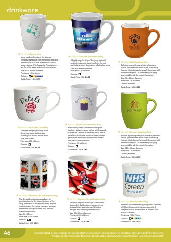 conference & exhibition drinkware46 Unless stated, prices include personalisation in one colour, one position. Origination, carriage and VAT are extra.Please contact our sales team for an up to date and accurate quotation on your chosen products.%uf0ec%u000946-10119 Durham Dye Sublimation MugThe most popular of the Dye Sublimation shapes. Dye Sublimation enables you to achieve bright eye catching full colour designs, with the brightest of colours.Size: 93 x 80mm diameterPrint area: 220 x 82mmColours: %uf0a2Guide Price: 108 %u00a33.48%uf0ec%u000946-10152 Marrow MugLarge sleek and modern, the Marrow certainly stands out from the crowd and not just because of its size. Available in 7 stock glaze colours. 375ml capacity. Prices shown are for white glaze, colours at extra charge.Size: 107 x 85mm diameterPrint area: 185 x 40mmColours: %uf0a2%uf0a2%uf0a2%uf0a2%uf0a2%uf0a2%uf0a2Guide Price: 108 %u00a33.15%uf0ec%u000946-09185 Deco Dye Sublimation MugA highly angular shape. This jazzy style will certainly make you stand out from the rest particularly when showcasing a full colour print.Size: 95 x 90mm diameterPrint area: 170 x 85mmColours: %uf0a2Guide Price: 108 %u00a34.48%uf0ec%u000946-10083 Cambridge Dye Sublimation MugThe dye sublimation process allows for printing closer to the lip and bottom of the mug, and closer to the handle. When applied to white mugs, the colour contrasts between the neutral background and your chosen images is stunning.Size: 93 x 80mmPrint area: 215 x 85mmColours: %uf0a2%uf0a2Guide Price: 252 %u00a33.49%uf0ec%u000946-41914 Kent Bone China MugThis light-weight yet sturdy bone china mug has a stylish shape allowing it to fit into any location.Size: 80 x 85mmPrint area: 200 x 85mmColours: %uf0a2Guide Price: 108 %u00a35.56%uf0ec%u000946-05736 White Sandfield MugFantastic value! Best selling mug with a capacity of 300ml. Prices are for white mugs only. A range of colours are available at an extra cost.Size: 93 x 81mmPrint area: 190 x 75mmColours: %uf0a2%uf0a2%uf0a2%uf0a2%uf0a2%uf0a2%uf0a2Guide Price: 288 %u00a32.55%uf0ec%u000946-05612 Newbury Earthenware MugA beautifully flared Earthenware mug, the Newbury features classic styling which appeals to all tastes. Despite its relatively small size, it has a large print area, meaning it%u2019s an elegant gift with an impressive promotional impact.Size: 98 x 85mm diameterPrint area: 185 x 65mmColours: %uf0a2Guide Price: 108 %u00a32.91%uf0ec%u000946-44583 Bell ColourCoat MugBell style mug with your choice of pantone colour applied to the entire outer of the mug. Now certified dishwasher proof! Decorated with a screen over print. Co-ordinated packaging also available, ask for more information.Size: 93 x 80mm diameterPrint area: 185 x 40mmColours: to orderGuide Price: 288 %u00a34.65%uf0ec%u000946-44580 Marrow ColourCoat MugMarrow style mug with your choice of pantone colour applied to the entire outer of the mug. Now certified dishwasher proof! Decorated with a screen over print. Co-ordinated packaging also available, ask for more information.Size: 107 x 85mm diameterPrint area: 185 x 40mmColours: to orderGuide Price: 288 %u00a36.15