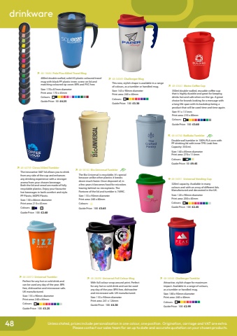 conference & exhibition drinkware48 Unless stated, prices include personalisation in one colour, one position. Origination, carriage and VAT are extra.Please contact our sales team for an up to date and accurate quotation on your chosen products.%uf0ec%u000948-26072 Universal TumblerPerfect for any hot or cold drink and can be used any day of the year. BPA free, dishwasher and microwave safe. UK manufactured.Size: 155 x 90mm diameterPrint area: 240 x 80mmColours: %uf0a2%uf0a2%uf0a2%uf0a2%uf0a2%uf0a2%uf0a2%uf0a2%uf0a2%uf0a2Guide Price: 100 %u00a33.25%uf0ec%u000948-28490 Universal Full Colour MugWith full colour wrap around print. Perfect for any hot or cold drink and can be used any day of the year. BPA free, dishwasher and microwave safe. UK manufactured.Size: 155 x 90mm diameterPrint area: 241 x 126mmGuide Price: 100 %u00a34.30%uf0ec%u000948-34048 Challenger TumblerAttractive, stylish shape for maximum impact. Available in a range of colours, as a tumbler or handled mug.Size: 180 x 90mm diameterPrint area: 240 x 40mmColours: %uf0a2%uf0a2%uf0a2%uf0a2%uf0a2%uf0a2%uf0a2%uf0a2%uf0a2Guide Price: 100 %u00a32.99%uf0e7%u000948-34051 Universal Vending Cup320ml capacity. Available in many colours and with an array of different lids. Manufactured and decorated in the UK.Size: 120 x 90mm diameterPrint area: 200 x 40mmColours: %uf0a2%uf0a2%uf0a2%uf0a2%uf0a2%uf0a2%uf0a2%uf0a2%uf0a2%uf0a2Guide Price: 100 %u00a32.45%uf0ec%u000948-34049 Challenger MugThis new, stylish shape is available in a range of colours, as a tumbler or handled mug.Size: 163 x 90mm diameterPrint area: 240 x 40mmColours: %uf0a2%uf0a2%uf0a2%uf0a2%uf0a2%uf0a2%uf0a2%uf0a2%uf0a2Guide Price: 100 %u00a33.30%uf0ec%u000948-18684 Polo Plus 400ml Travel Mug400ml double walled, solid AS plastic coloured travel mug with black PP plastic inner, screw on lid and matching coloured sip cover. BPA and PVC free.Size: 170 x 87mm diameterPrint area: 170 x 45mmColours: %uf0a2%uf0a2%uf0a2%uf0a2%uf0a2%uf0a2%uf0a2%uf0a2%uf0a2%uf0a2%uf0a2%uf0a2%uf0a2Guide Price: 50 %u00a34.25%uf0ec%u000948-38102 Bio Universal TumblerThe Bio Universal is recyclable. It's special because unlike other plastics it breaks down much faster. Once disposed of, in a few years it becomes food for microbes leaving behind no microplastic. The Pantone of the lid and tumbler is 7499C.Size: 155 x 90mm diameterPrint area: 240 x 80mmColours: %uf0a2Guide Price: 100 %u00a33.65%uf0ec%u000948-43641 Metro Coffee Cup350ml double-walled, reusable coffee cup that is highly durable and great for keeping drinks hot and safe when on-the-go. A great choice for brands looking for a message with a long-life span with its backdrop being a product that will be used time and time again.Size: 91 x 131mmPrint area: 210 x 80mmColours: %uf0a2%uf0a2%uf0a2%uf0a2%uf0a2%uf0a2%uf0a2%uf0a2%uf0a2%uf0a2Guide Price: 100 %u00a33.60%uf0ec%u000948-44759 Cirrus 350ml TumblerThe innovative 360%u00b0 lid allows you to drink from any side of the cup and enhances any drinking experience with a stronger aroma from your chosen beverage. Both the lid and vessel are made of fully recyclable plastics. Enjoy your favourite hot beverages in both comfort and style. PP Plastic, MDPE Plastic.Size: 130 x 86mm diameterPrint area: 210 x 45mmColours: %uf0a2%uf0a2%uf0a2%uf0a2Guide Price: 100 %u00a32.60%uf0eb%u000948-44760 BeiBaku TumblerDouble wall tumbler in 100% PLA corn with PP drinking lid with inner TPR. Leak free. Capacity: 350 ml.Size: 140 x 85mm diameterPrint area: 270 x 114mmColours: %uf0a2%uf0a2%uf0a2%uf0a2Guide Price: 50 %u00a39.45