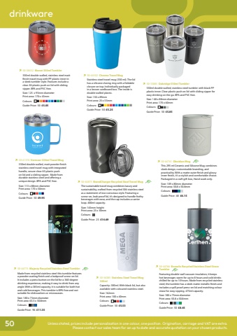 conference & exhibition drinkware50 Unless stated, prices include personalisation in one colour, one position. Origination, carriage and VAT are extra.Please contact our sales team for an up to date and accurate quotation on your chosen products.%uf0ec%u000950-36385 Stainless Steel Travel Mug 300mlCapacity: 300ml. With black lid, but also available with coloured stainless steel.Size: 162mmPrint area: 100 x 40mmColours: %uf0a2%uf0a2%uf0a2%uf0a2%uf0a2Guide Price: 50 %u00a35.53%uf0ec%u000950-41376 Vermeer 350ml Travel Mug350ml double walled, matt powder finish stainless steel travel mug with integrated handle, secure clear AS plastic push on lid and a sliding sipper. Made from durable stainless steel and offering a unique design. BPA and PVC free.Size: 113 x 88mm diameterPrint area: 170 x 50mmColours: %uf0a2%uf0a2%uf0a2%uf0a2%uf0a2Guide Price: 50 %u00a39.95%uf0ec%u000950-33085 Oakridge 550ml Tumbler550ml double walled, stainless steel tumbler with black PP plastic inner. Clear plastic push on lid with sliding sipper for easy drinking on the go. BPA and PVC free.Size: 168 x 88mm diameterPrint area: 170 x 60mmColours: %uf0a2%uf0a2%uf0a2%uf0a2Guide Price: 50 %u00a35.85%uf0ec%u000950-38452 Monet 350ml Tumbler350ml double walled, stainless steel matt finish travel mug with PP plastic inner in a sleek tumbler style. Features include a clear AS plastic push on lid with sliding sipper. BPA and PVC free.Size: 125 x 95mm diameterPrint area: 170 x 45mmColours: %uf0a2%uf0a2%uf0a2%uf0a2%uf0a2%uf0a2%uf0a2%uf0a2%uf0a2%uf0a2%uf0a2Guide Price: 50 %u00a35.05%uf0ec%u000950-44302 Chroma Travel MugStainless steel travel mug (350 ml). The lid has a silicone closing ring with a foldable closure on top. Individually packaged in a brown cardboard box. The inside is double walled plastic.Size: 150 x 89mmPrint area: 25 x 55mmColours: %uf0a2%uf0a2%uf0a2%uf0a2%uf0a2%uf0a2%uf0a2%uf0a2%uf0a2%uf0a2%uf0a2%uf0a2Guide Price: 50 %u00a35.25%uf0ec%u000950-44761 Obsidian MugThis 295 ml Ceramic and Silicone Mug combines sleek design, customisable branding, and practicality. With a matte outer finish and glossy inner finish, it's a stylish and comfortable choice. Packaged in a craft gift box, Hand wash only.Size: 109 x 80mm diameterPrint area: 50.8 x 50.8mmColours: Guide Price: 48 %u00a36.15%uf0ec%u000950-44773 Majesty Recycled Stainless Steel TumblerMade from recycled stainless steel this tumbler features a powder coating finish and a leakproof screw-on lid. It includes a press button on the lid for a 360-degree drinking experience, making it easy to drink from any angle. With a 385ml capacity, it is suitable for both hot and cold beverages. This tumbler is BPA-free and not suitable for dishwashers or microwaves.Size: 180 x 75mm diameterPrint area: 63.5 x 50.8mmColours: Guide Price: 96 %u00a311.35%uf0ec%u000950-44766 Borealis Recycled Stainless Steel Straw TumblerFeaturing double-wall vacuum insulation, it keeps hot beverages warm for up to 8 hours and cold drinks chilled for up to 10 hours. Made from recycled stainless steel, the tumbler has a sleek matte metallic finish and includes a spill proof press-on lid and matching colour straw for easy sipping. 475ml capacity.Size: 180 x 75mm diameterPrint area: 50.8 x 50.8mmColours: Guide Price: 50 %u00a38.45%uf0ec%u000950-44875 BrandCharger Recycled Steel Travel MugThe sustainable travel mug combines luxury and sustainability, crafted from recycled 304 stainless steel as a statement of eco-conscious style. Featuring a screw-on, leak-proof lid, it%u2019s designed to handle frothy beverages with ease, and the cap includes a carrier loop. 400ml capacity.Size: 145mm heightPrint area: 25 x 30mmColours: Guide Price: 25 %u00a314.69