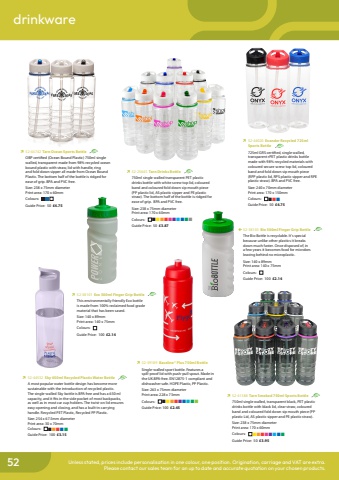 conference & exhibition drinkware52 Unless stated, prices include personalisation in one colour, one position. Origination, carriage and VAT are extra.Please contact our sales team for an up to date and accurate quotation on your chosen products.%uf0ec%u000952-41388 Tarn Smoked 750ml Sports Bottle750ml single walled, transparent black, PET plastic drinks bottle with black lid, clear straw, coloured band and coloured fold down sip mouth piece (PP plastic Lid, AS plastic sipper and PE plastic straw).Size: 238 x 75mm diameterPrint area: 170 x 60mmColours: %uf0a2%uf0a2%uf0a2%uf0a2%uf0a2%uf0a2%uf0a2%uf0a2%uf0a2Guide Price: 50 %u00a33.95%uf0ec%u000952-44532 Sky 650ml Recycled Plastic Water BottleA most popular water bottle design has become more sustainable with the introduction of recycled plastic. The single-walled Sky bottle is BPA free and has a 650 ml capacity, and it fits in the side pocket of most backpacks, as well as in most car cup holders. The twist-on lid ensures easy opening and closing, and has a built-in carrying handle. Recycled PET Plastic, Recycled PP Plastic.Size: 254 x 67.5mm diameterPrint area: 30 x 70mmColours: %uf0a2%uf0a2%uf0a2%uf0a2%uf0a2%uf0a2Guide Price: 100 %u00a33.15%uf0ec%u000952-25645 Tarn Drinks Bottle750ml single walled transparent PET plastic drinks bottle with white screw top lid, coloured band and coloured fold down sip mouth piece (PP plastic lid, AS plastic sipper and PE plastic straw). The bottom half of the bottle is ridged for ease of grip. BPA and PVC free.Size: 238 x 75mm diameterPrint area: 170 x 60mmColours: %uf0a2%uf0a2%uf0a2%uf0a2%uf0a2%uf0a2%uf0a2%uf0a2%uf0a2%uf0a2%uf0a2Guide Price: 50 %u00a33.87%uf0ec%u000952-44020 Evander Recycled 725ml Sports Bottle725ml GRS certified, single walled, transparent rPET plastic drinks bottle made with 98% recycled materials with coloured secure screw top lid, coloured band and fold down sip mouth piece (RPP plastic lid, RPS plastic sipper and RPE plastic straw). BPA and PVC free.Size: 240 x 70mm diameterPrint area: 170 x 150mmColours: %uf0a2%uf0a2%uf0a2%uf0a2Guide Price: 50 %u00a34.75%uf0e7%u000952-38103 Bio 500ml Finger Grip BottleThe Bio Bottle is recyclable. It's special because unlike other plastics it breaks down much faster. Once disposed of, in a few years it becomes food for microbes leaving behind no microplastic.Size: 140 x 89mmPrint area: 140 x 75mmColours: %uf0a2Guide Price: 100 %u00a32.14%uf0ec%u000952-38101 Eco 500ml Finger Grip BottleThis environmentally friendly Eco bottle is made from 100% reclaimed food grade material that has been saved.Size: 140 x 89mmPrint area: 140 x 75mmColours: %uf0a2Guide Price: 100 %u00a32.14%uf0ec%u000952-44742 Tarn Ocean Sports BottleOBP certified (Ocean Bound Plastic) 750ml single walled, transparent made from 98% recycled ocean bound plastic with straw, lid with handle, ring and fold down sipper all made from Ocean Bound Plastic. The bottom half of the bottle is ridged for ease of grip. BPA and PVC free.Size: 238 x 75mm diameterPrint area: 170 x 60mmColours: Guide Price: 50 %u00a34.75%uf0ec%u000952-39189 Baseline%u00ae Plus 750ml BottleSingle-walled sport bottle. Features a spill-proof lid with push-pull spout. Made in the UK.BPA-free. EN12875-1 compliant and dishwasher safe. HDPE Plastic, PP Plastic.Size: 263 x 75mm diameterPrint area: 228 x 73mmColours: %uf0a2%uf0a2%uf0a2%uf0a2%uf0a2%uf0a2%uf0a2%uf0a2%uf0a2%uf0a2Guide Price: 100 %u00a32.45