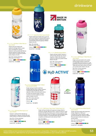 53drinkwareUnless stated, prices include personalisation in one colour, one position. Origination, carriage and VAT are extra.Please contact our sales team for an up to date and accurate quotation on your chosen products.%uf0ec%u000953-38130 H2O Eco Base 650ml Flip Lid Sports BottleSingle-wall sport bottle with ergonomic design. Made from 100% postconsumer PET scraps. Features a spillproof lid with flip top. Capacity is 650ml. Mix and match colours to create your perfect bottle.Size: 224 x 73.5mm diameterPrint area: 210 x 75mmColours: %uf0a2%uf0a2%uf0a2%uf0a2%uf0a2%uf0a2%uf0a2%uf0a2%uf0a2%uf0a2%uf0a2Guide Price: 100 %u00a34.70%uf0ec%u000953-38256 H2O Vibe 850ml Spout Lid Sports BottleFeatures a spill-proof lid with flip-top drinking spout. Capacity is 850ml. Mix and match colours to create your perfect bottle.Size: 243 x 73.5mm diameterPrint area: 210 x 165mmColours: %uf0a2%uf0a2%uf0a2%uf0a2%uf0a2%uf0a2%uf0a2%uf0a2%uf0a2%uf0a2Guide Price: 100 %u00a35.15%uf0ec%u000953-39359 H2O Octave Tritan%u2122 600ml Flip Lid Sports BottleSingle-wall sport bottle made from durable, BPA-free Tritan material. Features a spill-proof lid with flip top. Volume capacity is 600 ml. Mix and match colours to create your perfect bottle. Contact customer service for additional colour options. Made in the UK.Size: 199 x 75mm diameterPrint area: 200 x 73mmColours: %uf0a2Guide Price: 100 %u00a33.75%uf0ec%u000953-39475 H2O Active%u00ae Base Tritan%u2122 650ml Spout LidSingle-wall sport bottle with ergonomic design. Bottle is made from durable, BPA-free Tritan%u2122 material. Features a spillproof lid with flip-top drinking spout. Volume capacity is 650 ml. Mix and match colours to create your perfect bottle. Made in Europe. Packed in a recycled PE plastic bag. EN12875-1 compliant and dishwasher safe. Eastman Tritan%u2122.Size: 218 x 89mmPrint area: 210 x 75mmColours: %uf0a2%uf0a2%uf0a2%uf0a2%uf0a2%uf0a2%uf0a2%uf0a2%uf0a2%uf0a2Guide Price: 100 %u00a35.25%uf0ec%u000953-35744 Baseline Sports BottleSingle-wall sport bottle. Features a spill-proof lid with flip top. Volume capacity is 500ml. Mix and match colours to create your perfect bottle. Made in the UK.Size: 180 x 72mm diameterPrint area: 100 x 90mmColours: %uf0a2%uf0a2%uf0a2%uf0a2%uf0a2%uf0a2%uf0a2%uf0a2%uf0a2%uf0a2Guide Price: 100 %u00a32.57Alsavailable aso750ml%uf0ec%u000953-40076 H2O Tempo%u00ae 700ml Flip Lid Sport BottleSingle-wall sport bottle with a stylish, slimline design. Bottle is made from recyclable PET material. Features a spillproof lid with flip top. Volume capacity is 700ml. Mix and match colours to create your perfect bottle. Made in the UK.Size: 239 x 73.5mm diameterPrint area: 210 x 80mmColours: %uf0a2%uf0a2%uf0a2%uf0a2%uf0a2%uf0a2%uf0a2%uf0a2%uf0a2%uf0a2%uf0a2Guide Price: 100 %u00a34.05%uf0ec%u000953-41355 HydroFlex 500ml Sports BottleSingle-walled sport bottle with a screw-fix pull-up lid. Made from flexible MDPE plastic, this squeezy bottle is perfect for sporting environments. Volume capacity is 500ml. Made in the UK.Size: 183 x 43.5mmPrint area: 220 x 70mmColours: %uf0a2%uf0a2%uf0a2%uf0a2%uf0a2%uf0a2%uf0a2%uf0a2%uf0a2%uf0a2%uf0a2Guide Price: 100 %u00a32.68%uf0ec%u000953-39412 H2O Base%u00ae 650ml Flip Lid Sport BottleSingle-wall sport bottle with ergonomic design. Bottle is made from recyclable PET material. Features a spill-proof lid with flip top. Volume capacity is 650ml. Mix and match colours to create your perfect bottle. Made in the UK.Size: 224 x 73.5mm diameterPrint area: 210 x 75mmColours: %uf0a2%uf0a2%uf0a2%uf0a2%uf0a2%uf0a2%uf0a2%uf0a2%uf0a2%uf0a2%uf0a2Guide Price: 100 %u00a34.05ALL PRODUCTS