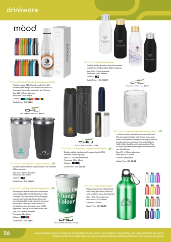 conference & exhibition drinkware56 Unless stated, prices include personalisation in one colour, one position. Origination, carriage and VAT are extra.Please contact our sales team for an up to date and accurate quotation on your chosen products.%uf0ec%u000956-44900 Mood%u00ae Powder Coated Vacuum BottlePowder coated 500ml bottle made from 304 stainless steel. Keeps cold drinks ice-cool for 24 hours and hot drinks piping hot for 12 hours.Size: 263 x 67mm diameterPrint area: 170 x 90mmColours: Guide Price: 250 %u00a36.85%uf0ec%u000956-44901 Stella Vacuum BottleDouble-walled stainless steel with painted matt finish. LFGB certified, 600ml capacity. Size: 230 x 77mm diameterPrint area: 190 x 100mmColours: Guide Price: 100 %u00a312.39%uf0ec%u000956-44902 Chili Concept - Calypso TumblerDouble walled stainless steel tumbler. FDA certified, 500ml capacity.Size: 175 x 90mm diameterPrint area: 30 x 30mmColours: Guide Price: 250 %u00a312.65%uf0ec%u000956-44903 Chili Concept - Calypso Vacuum BottleDouble walled stainless steel vacuum bottle. FDA certified, 500ml capacity.Size: 227 x 67.9mm diameterPrint area: 125 x 40mmColours: Guide Price: 250 %u00a311.45%uf0ec%u000956-44904 Calypso Double Wall Drinking GlassA 250ml marvel crafted from Borosilicate Glass. This innovative double-wall design keeps your drinks at the perfect temperature longer, without condensation or sweating. It's comfortable to hold, highly durable, and crack-resistant. Plus, it's fully recyclable, blending functionality with eco-friendliness.Size: 231 x 100mm diameterPrint area: 35 x 35mmColours: transparentGuide Price: 100 %u00a37.50%uf0e8%u000956-44944 Action Water BottleRobust, aluminium 550ml bottle with shiny gloss finish. Black lid with carabiner carry clip attached.Size: 190 x 73mm diameterPrint area: 170 x 100mmColours: as shownGuide Price: 250 %u00a32.95%uf0e8%u000956-44956 Chili Kop Colour Changing CupElevate your festival and event experience with the Kop GRS Certified Cup from Chili Concept. This cup comes to life, changing colours with iced cold drinks, delivering an unforgettable visual experience around your brand. The cup is made from GRS certified recycled aluminium and is FDA approved. The cup is not dishwasher safe.Size: 130 x 83mm diameterPrint area: 30 x 40mmColours: Guide Price: 250 %u00a33.65