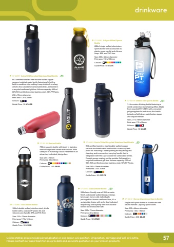 57drinkwareUnless stated, prices include personalisation in one colour, one position. Origination, carriage and VAT are extra.Please contact our sales team for an up to date and accurate quotation on your chosen products.%uf0ec%u000957-44957 Astra RCS Recycled Stainless Steel BottleRCS certified stainless steel double-walled copper vacuum insulated water bottle featuring a lid with a built-in carabiner clip, making it easy to attach to a bag or belt. Also suitable for carbonated drinks. Delivered in a recycled cardboard gift box. Volume capacity: 600 ml. 80% RCS certified recycled stainless steel, 10% PP Plastic.250 x 78mm diameterPrint area: 120 x 25mmColours: %uf0a2%uf0a2%uf0a2Guide Price: 50 %u00a316.50%uf0ec%u000957-38241 Korver Aluminium Sports BottleSingle wall sports bottle in aluminium with lid and handle. Capacity up to 650ml.Size: 250 x 66mm diameterPrint area: 130 x 130mmColours: %uf0a2%uf0a2%uf0a2%uf0a2%uf0a2%uf0a2%uf0a2Guide Price: 250 %u00a34.49%uf0ec%u000957-40862 Varo 500ml Bottle500ml double walled, stainless steel, drinks bottle with a colours PP plastic lid and silicone carry handle. BPA and PVC Free.Size: 220 x 72mm diameterPrint area: 170 x 120mmColours: %uf0a2%uf0a2%uf0a2%uf0a2Guide Price: 50 %u00a39.50%uf0ec%u000957-34981 Eclipse 600ml Sports Bottle600ml single walled, aluminium sports bottle with a coloured AS plastic screw top lid and silicone strap. BPA and PVC free.Size: 230 x 66mm diameterPrint area: 150 x 100mmColours: %uf0a2%uf0a2%uf0a2%uf0a2%uf0a2%uf0a2%uf0a2%uf0a2%uf0a2Guide Price: 50 %u00a34.75%uf0ec%u000957-38184 Rextan Bottle790ml capacity bottle with body in stainless steel of bright and varied matt colours. With safety lid in matching colour. Presented in an attractive, individual, design box.Size: 257 x 74mmPrint area: 20 x 80mmColours: %uf0a2%uf0a2%uf0a2%uf0a2%uf0a2%uf0a2%uf0a2%uf0a2%uf0a2%uf0a2%uf0a2Guide Price: 100 %u00a38.60%uf0ec 57-44739 Ombre 1ltr Sports Bottle1-Litre water drinking bottle featuring a stylish ombre two-tone fading effect. Made from recycled PET (rPET) with a recycled polypropylene lid and straw, this bottle includes a fold-down push-button sipper and lanyard handle.Size: 277 x 78mm diameterPrint area: 170 x 50mmColours: Guide Price: 50 %u00a36.65%uf0ec 57-44663 Fortis 700ml Recycled Stainless Steel BottleRCS certified stainless steel double-walled copper vacuum insulated water bottle with a screw-on, leakproof lid. Featuring a wide opening for easy filling and cleaning, and a convenient carrying handle that is integrated with the cap. Suitable for carbonated drinks. Durable power coating on the outside. Delivered in a recycled cardboard gift box. Volume capacity: 700 ml. 90% RCS certified recycled stainless steel, 10% PP Plastic.Size: 260 x 70mm diameterPrint area: 120 x 25mmColours: Guide Price: 50 %u00a317.75%uf0e7 57-44945 Alasia Water Bottle500ml eco-friendly marvel. With a matte finish and double walled design, it keeps beverages hot or cold. Individually packaged in a brown cardboard box, it's a sustainable choice with style. Stay hydrated responsibly and stylishly with this durable bottle. Not dishwasher safe.Size: 230 x 75mm diameterPrint area: 40 x 40mmColours: Guide Price: 50 %u00a37.69