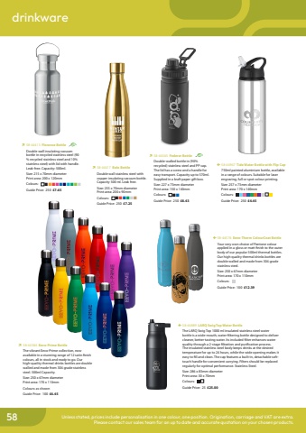 conference & exhibition drinkware58 Unless stated, prices include personalisation in one colour, one position. Origination, carriage and VAT are extra.Please contact our sales team for an up to date and accurate quotation on your chosen products.%uf0ec%u000958-44413 Florence BottleDouble wall insulating vacuum bottle in recycled stainless steel (90 % recycled stainless steel and 10% stainless steel) with lid with handle. Leak-free. Capacity: 500ml.Size: 215 x 70mm diameterPrint area: 200 x 120mmColours: %uf0a2%uf0a2%uf0a2%uf0a2%uf0a2%uf0a2%uf0a2%uf0a2%uf0a2%uf0a2%uf0a2Guide Price: 250 %u00a37.65%uf0e7 58-44889 LARQ Swig Top Water BottleThe LARQ Swig Top 1000 ml insulated stainless steel water bottle is a wide-mouth, water-filtering bottle designed to deliver cleaner, better-tasting water. Its included filter enhances water quality through a 2-stage filtration and purification process. The insulated stainless steel body keeps drinks at the desired temperature for up to 24 hours, while the wide opening makes it easy to fill and clean. The cap features a built-in, detachable softtouch handle for convenient carrying. Filters should be replaced regularly for optimal performance. Stainless Steel.Size: 286 x 83mm diameterPrint area: 30 x 70mmColours: Guide Price: 25 %u00a325.00%uf0ec%u000958-44365 Federer BottleDouble-walled bottle in (90% recycled) stainless steel and PP cap. The lid has a screw and a handle for easy transport. Capacity up to 570ml. Supplied in a kraft paper gift box.Size: 227 x 73mm diameterPrint area: 150 x 140mmColours: %uf0a2%uf0a2%uf0a2Guide Price: 250 %u00a38.43%uf0ec%u000958-44584 Eevo-Prime BottleThe vibrant Eevo-Prime collection, now available in a stunning range of 12 satin finish colours, all in stock and ready to go. Our high-quality thermal drinks bottles are double walled and made from 304 grade stainless steel. 500ml Capacity.Size: 250 x 67mm diameterPrint area: 170 x 110mmColours: as shownGuide Price: 100 %u00a36.45%uf0e7 58-44576 Eevo-Therm ColourCoat BottleYour very own choice of Pantone colour applied in a gloss or matt finish to the outer body of our popular 500ml thermal bottles. Our high quality thermal drinks bottles are double walled and made from 304 grade stainless steel.Size: 250 x 67mm diameterPrint area: 170 x 110mmColours: Guide Price: 100 %u00a312.39%uf0ec%u000958-44417 Belo BottleDouble wall stainless steel with copper insulating vacuum bottle. Capacity 500 ml. Leak free.Size: 255 x 70mm diameterPrint area: 200 x 90mmColours: %uf0a2%uf0a2%uf0a2%uf0a2%uf0a2%uf0a2%uf0a2Guide Price: 250 %u00a37.25%uf0e7 58-44947 Tide Water Bottle with Flip Cap750ml painted aluminium bottle, available in a range of colours. Suitable for laser engraving, full or spot colour printing.Size: 257 x 73mm diameterPrint area: 170 x 140mmColours: Guide Price: 250 %u00a34.45