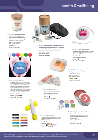 61health & wellbeingUnless stated, prices include personalisation in one colour, one position. Origination, carriage and VAT are extra.Please contact our sales team for an up to date and accurate quotation on your chosen products.%uf0e7%u000961-10760 Lip Balm StickTransparent plastic lip balm stick (white, silver and black are solid colours) with SPF15 protection.Size: 20 x 69mmPrint area: 35 x 45mmColours: %uf0a2%uf0a2%uf0a2%uf0a2%uf0a2%uf0a2%uf0a2%uf0a2%uf0a2Guide Price: 500 %u00a30.67%uf0ec%u000961-10698 Lip Balm in Aluminium Tin10ml natural base lip balm in an aluminium tin. Available in a range of flavours and colours upon request. Made in the UK.Size: 38 x 13mmPrint area: 32mm diameterColours: %uf0a2Guide Price: 250 %u00a32.35%uf0ec%u000961-20611 Promo Tape MeasureRetractable tailors Tape measure 1.5 metres with inches and centimetres on the tape. Case printed full colour.Size: 40mm diameterPrint area: 38mm diameterColours: %uf0a2Guide Price: 500 %u00a30.90%uf0e9%u000961-42593 Bandage BoxHandy pack of 10 First aid Plasters with full colour printed insert.Print area: 28 x 82mmColours: %uf0a2Guide Price: 250 %u00a30.88%uf0eb%u000961-18307 Serenity EarplugsEar plugs in snap travel case. PU Plastic foam, PP plastic.Size: 35 x 15 x 35mmPrint area: 19 x 19mmColours: %uf0a2%uf0a2%uf0a2Guide Price: 500 %u00a30.78%uf0ec%u000961-44362 Zen Aromatic CandleAromatic candle in a glass cup with a cork lid. The fragrance helps make your home a more relaxing environment. Made in Europe.Size: 95 x 75mm diameterPrint area: 50 x 40mmColours: %uf0a2Guide Price: 250 %u00a36.15%uf0e9%u000961-42303 Kison Heat PackKeep your hands warm with winter with our reusable circular heat pack. Supplied with metal plate for activating. To reuse, heat water in a container with the patch inside until the inside gel returns to its liquid state and press the metal plate back into place. Great for university students and professionals on their daily commute.Print area: 40 x 40mmColours: %uf0a2%uf0a2%uf0a2%uf0a2%uf0a2%uf0a2Guide Price: 250 %u00a31.85%uf0e9%u000961-40967 The Little Brown Tube Mental Health KitA handy relaxing mental wellbeing kit in a cardboard tube, that includes a sleep balm, sleep mask, roll on pulse point and natural relaxing foam bath.Size: 130 x 76 x 76mmPrint area: 74 x 65mmGuide Price: 250 %u00a39.15