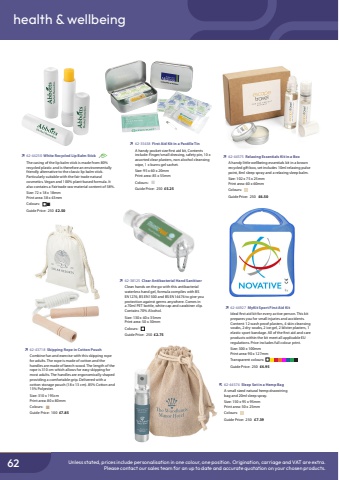 health & wellbeing62 Unless stated, prices include personalisation in one colour, one position. Origination, carriage and VAT are extra.Please contact our sales team for an up to date and accurate quotation on your chosen products.%uf0ec%u000962-43718 Skipping Rope in Cotton PouchCombine fun and exercise with this skipping rope for adults. The rope is made of cotton and the handles are made of beech wood. The length of the rope is 310 cm which allows for easy skipping for most adults. The handles are ergonomically shaped providing a comfortable grip. Delivered with a cotton storage pouch (18 x 13 cm). 85% Cotton and 15% Polyester.Size: 310 x 195cmPrint area: 80 x 80mmColours: %uf0a2Guide Price: 100 %u00a37.85%uf0ec%u000962-35438 First Aid Kit in a Pastille TinA handy pocket size first aid kit, Contents include: Finger/small dressing, safety pin, 10 x assorted clear plasters, non alcohol cleansing wipe, 1 x burns gel sachet.Size: 95 x 60 x 20mmPrint area: 85 x 55mmColours: %uf0a2Guide Price: 250 %u00a35.25%uf0ec%u000962-44250 White Recycled Lip Balm StickThe casing of the lip balm stick is made from 80% recycled plastic and is therefore an environmentally friendly alternative to the classic lip balm stick. Particularly suitable with the fair trade natural cosmetics. Vegan and 100% plant-based formula. It also contains a Fairtrade raw material content of 58%.Size: 72 x 18 x 18mmPrint area: 38 x 43mmColours: %uf0a2%uf0a2Guide Price: 250 %u00a32.50%uf0ec%u000962-38125 Clear Antibacterial Hand SanitiserClean hands on the go with this antibacterial waterless hand gel, formula complies with BS EN1276, BS EN1500 and BS EN14476 to give you protection against germs anywhere. Comes in a 70ml PET bottle, white cap and carabiner clip. Contains 70% Alcohol.Size: 130 x 40 x 35mmPrint area: 50 x 30mmColours: %uf0a2Guide Price: 250 %u00a32.75%uf0eb%u000962-44574 Sleep Set in a Hemp BagA small sized natural hemp drawstring bag and 20ml sleep spray.Size: 150 x 95 x 95mmPrint area: 50 x 25mmColours: Guide Price: 250 %u00a37.39%uf0ec 62-44575 Relaxing Essentials Kit in a BoxA handy little wellbeing essentials kit in a brown recycled gift box, set includes 10ml relaxing pulse point, 8ml sleep spray and a relaxing sleep balm.Size: 102 x 75 x 25mmPrint area: 60 x 60mmColours: Guide Price: 250 %u00a36.50%uf0ec%u000962-44927 MyKit Sport First Aid KitIdeal first aid kit for every active person. This kit prepares you for small injuries and accidents. Content: 12 wash proof plasters, 4 skin cleansing swabs, 2 dry swabs, 2 ice gel, 2 blister plasters, 1 elastic sport bandage. All of the first aid and care products within the kit meet all applicable EU regulations. Price includes full colour print.Size: 300 x 100mmPrint area: 90 x 127mmTransparent colours: Guide Price: 250 %u00a34.95