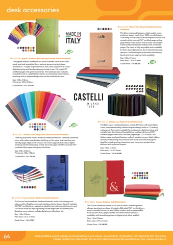desk accessories 64 Unless stated, prices include personalisation in one colour, one position. Origination, carriage and VAT are extra.Please contact our sales team for an up to date and accurate quotation on your chosen products.%uf0ec%u000964-44408 Appeel 'Predaia' Medium Apple Paper Ruled NotebookThe Appeel %u2018Predaia%u2019 notebook has an eco-leather cover made from apple peel and vegetable fibres, using a pioneering technique. Available in 13 apple-inspired colours, the cover supports full-colour digital printing and blind embossing. Inside, it has 192 ivory FSC%u00ae certified pages with green ruled lines. The notebook also includes rounded corners, a gold ribbon marker, a contrasting closure band, pen loop and an expandable pocket on the inside back cover.Size: 130 x 210mm Print area: 129 x 214mmGuide Price: 100 %u00a311.03%uf0ec%u000964-44407 Prisma 100% Recyclable Medium Ruled NotebookThe fully recyclable %u2018Prisma%u2019 medium notebook features a flexible cardboard cover with colour-coordinated stitching on the spine and matching ecofriendly page edges in 19 colours. The cover supports full-colour digital printing and foil embossing. Inside, it has 64 pages of 100% recycled FSC%u00ae certified white paper with grey ruled lines.Size: 130 x 210mm Print area: 108 x 190mmGuide Price: 100 %u00a33.82%uf0ec%u000964-44410 Tucson Smart Medium Ruled NotebookThe Tucson Smart medium notebook features a soft-touch design in 6 colours with a flexible cover and matching elastic closure band. It includes 224 FSC%u00ae certified ivory pages in a ruled format, with rounded corners and a cut flush cover for digital printing on the edge with eco-friendly inks. Branding cover options include digital print, blind and foil.Size: 130 x 210mm Print area: 125 x 210mmGuide Price: 100 %u00a37.97%uf0ec%u000964-26261 Tucson Medium Ruled NotebookThe Tucson notebook comes in 20 colours with a matching elastic closure band and pen loop. It includes 224 ruled FSC%u00ae certified ivory pages, rounded corners, a gold ribbon marker, and an expandable back pocket. Plain, graph, dotted and other formats are also available, with branding options in digital print, blind and foil.Size: 130 x 210mm Print area: 129 x 214mmGuide Price: 100 %u00a38.55%uf0ec%u000964-44725 Black Laser Medium Ruled NotebookThe Black Laser notebook features a sleek, PVC-free soft-touch black cover, complemented by vibrant lacquered edge trims in 17 striking colourways. The cover is suitable for embossing, digital printing, and metallic foils. Consisting of beautiful ivory-coloured internal FSC%u00ae certified pages with black coloured page edges (224 in total). This Italian-made notebook features crafted rounded corners, black ribbon marker, coordinating closure band and black coloured end papers. Ideal for brands seeking a luxurious, eco-conscious product that delivers both style and impact.Size: 130 x 210mm Print area: 129 x 214mmGuide Price: 100 %u00a310.49%uf0e7%u000964-44726 Shiro 100% Recycled Medium Ruled NotebookThe Shiro notebook features a high-quality cover and inner pages, made from 100% recycled paper. Consisting of 6 beautiful nature-inspired colours and smooth white internal FSC%u00ae certified pages with a grey dotted ruled format (160 in total). This Italianmade notebook features indexed and numbered pages. The cover is fully recyclable and is suitable for full-colour digital print, foil or blind embossing options. Coordinating recycled white advertising bands and inner pages are also available.Size: 130 x 210mm Print area: 129 x 107mmGuide Price: 100 %u00a36.50