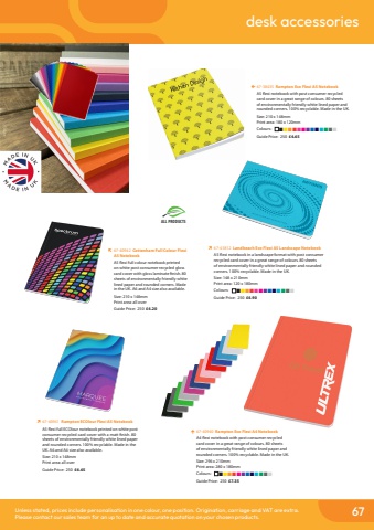 67desk accessoriesUnless stated, prices include personalisation in one colour, one position. Origination, carriage and VAT are extra.Please contact our sales team for an up to date and accurate quotation on your chosen products.%uf0e9%u000967-40940 Rampton Eco Flexi A4 NotebookA4 flexi notebook with post consumer recycled card cover in a great range of colours. 80 sheets of environmentally friendly white lined paper and rounded corners. 100% recyclable. Made in the UK.Size: 296 x 210mmPrint area: 280 x 180mmColours: %uf0a2%uf0a2%uf0a2%uf0a2%uf0a2%uf0a2%uf0a2%uf0a2%uf0a2%uf0a2%uf0a2%uf0a2%uf0a2Guide Price: 250 %u00a37.35%uf0e7%u000967-38435 Rampton Eco Flexi A5 NotebookA5 flexi notebook with post consumer recycled card cover in a great range of colours. 80 sheets of environmentally friendly white lined paper and rounded corners. 100% recyclable. Made in the UK.Size: 210 x 148mmPrint area: 180 x 120mmColours: %uf0a2%uf0a2%uf0a2%uf0a2%uf0a2%uf0a2%uf0a2%uf0a2%uf0a2%uf0a2%uf0a2%uf0a2%uf0a2%uf0a2Guide Price: 250 %u00a34.65%uf0ec%u000967-40941 Rampton ECOlour Flexi A5 NotebookA5 flexi full ECOlour notebook printed on white post consumer recycled card cover with a matt finish. 80 sheets of environmentally friendly white lined paper and rounded corners. 100% recyclable. Made in the UK. A6 and A4 size also available.Size: 210 x 148mmPrint area: all overGuide Price: 250 %u00a36.65%uf0eb%u000967-40942 Cottenham Full Colour Flexi A5 NotebookA5 flexi full colour notebook printed on white post consumer recycled gloss card cover with gloss laminate finish. 80 sheets of environmentally friendly white lined paper and rounded corners. Made in the UK. A6 and A4 size also available.Size: 210 x 148mmPrint area: all overGuide Price: 250 %u00a34.20%uf0ec%u000967-43812 Landbeach Eco Flexi A5 Landscape NotebookA5 flexi notebook in a landscape format with post consumer recycled card cover in a great range of colours. 80 sheets of environmentally friendly white lined paper and rounded corners. 100% recyclable. Made in the UK.Size: 148 x 210mmPrint area: 120 x 180mmColours: %uf0a2%uf0a2%uf0a2%uf0a2%uf0a2%uf0a2%uf0a2%uf0a2%uf0a2%uf0a2%uf0a2%uf0a2%uf0a2%uf0a2Guide Price: 250 %u00a34.90ALL PRODUCTS