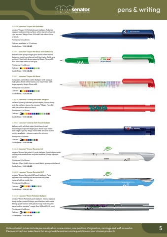 5pens & writingUnless stated, prices include personalisation in one colour, one position. Origination, carriage and VAT are extra.Please contact our sales team for an up to date and accurate quotation on your chosen products.5-34912 senator%u00ae Super Hit Basic with Soft GripBallpen with opaque high-gloss finish white barrel, featuring matching clip and soft-feel, satin-finish grip section. Fitted with large capacity Magic Flow refill. Also available without soft grip.Print area: 35 x 20mm Colours: %uf0a2%uf0a2%uf0a2%uf0a2%uf0a2%uf0a2%uf0a2%uf0a2%uf0a2%uf0a2Guide Price: 1000 %u00a30.505-43590 senator%u00ae Super Hit Polishedsenator%u00ae Super Hit Polished push ballpen, Polished opaque body and clip surface, white barrel, coloured clip, senator%u00ae Magic Flow X20 refill. Ink colour: blue or black.Print area: 50 x 20mmColours: available in 15 coloursGuide Price: 1000 %u00a30.455-44639 senator%u00ae Evoxx Recycled MCsenator%u00ae Evoxx Recycled MC push ballpen. Push ballpen with visible parts made from recycled material with a metal clip.Print area: 28 x 20mm Colours: %uf0a2%uf0a2%uf0a2%uf0a2%uf0a2%uf0a2%uf0a2%uf0a2%uf0a2%uf0a2%uf0a2Guide Price: 1000 %u00a31.055-34911 senator%u00ae Super Hit BasicEvergreen and million seller. Ballpen with opaque high-gloss finish white barrel, and clip. Fitted with large capacity Magic Flow refill.Print area: 50 x 20mm Colours: %uf0a2%uf0a2%uf0a2%uf0a2%uf0a2%uf0a2%uf0a2%uf0a2%uf0a2%uf0a2Guide Price: 1000 %u00a30.455-20557 senator%u00ae Liberty Soft Touch BallpenBallpen with soft-feel, satin-finish barrel and matching transparent high-gloss finish clip. Fitted with large capacity Magic Flow refill. Mix and Match service available - please enquire for pricing.Print area: 40 x 6mm Colours: %uf0a2%uf0a2%uf0a2%uf0a2%uf0a2%uf0a2%uf0a2%uf0a2%uf0a2Guide Price: 1000 %u00a30.995-20556 senator%u00ae Liberty Polished Ballpensenator%u00ae Liberty Polished push ballpen, Glossy body and clip surface, glossy tip, senator%u00ae Magic Flow G2 refill, ink colour: blue or black.Print area: 45 x 20mm Colours: %uf0a2%uf0a2%uf0a2%uf0a2%uf0a2%uf0a2%uf0a2%uf0a2%uf0a2%uf0a2%uf0a2%uf0a2%uf0a2%uf0a2%uf0a2Guide Price: 1000 %u00a30.645-34249 senator%u00aePoint Polished Ballpensenator%u00ae Point Polished push ballpen. Glossy opaque body surface, metal fittings, push button with metal fittings push button with plastic inlay matching the barrel colour. senator%u00ae magic flow X20 refill (1.0 mm).Print area: 40 x 20mm Colours: %uf0a2%uf0a2%uf0a2%uf0a2%uf0a2%uf0a2%uf0a2%uf0a2%uf0a2%uf0a2Guide Price: 1000 %u00a30.555-44638 senator%u00ae Evoxx Recycled LCsenator%u00ae Evoxx Recycled LC push ballpen. Push ballpen with visible parts made from recycled material. Glossy opaque barrel.Print area: 28 x 20mm Colours: Clips: Gold, silver or matt black, glossy white barrelGuide Price: 1000 %u00a30.82