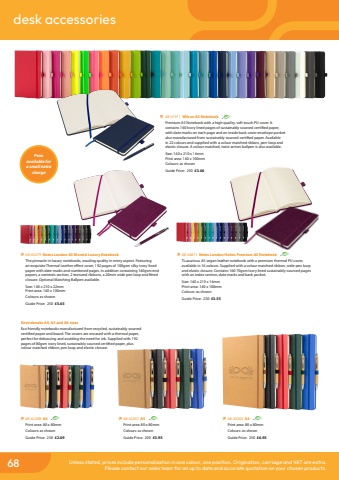 desk accessories 68 Unless stated, prices include personalisation in one colour, one position. Origination, carriage and VAT are extra.Please contact our sales team for an up to date and accurate quotation on your chosen products.%uf0eb 68-41911 Wilson A5 NotebookPremium A5 Notebook with a high quality, soft touch PU cover. It contains 160 Ivory lined pages of sustainably sourced certified paper, with date marks on each page and an inside back cover envelope pocket also manufactured from sustainably sourced certified paper. Available in 22 colours and supplied with a colour matched ribbon, pen-loop and elastic closure. A colour matched, twist-action ballpen is also available.Size: 140 x 210 x 16mmPrint area: 140 x 100mmColours: as shownGuide Price: 250 %u00a33.66%uf0ec 68-44279 Notes London A5 Moretti Luxury NotebookThe pinnacle in luxury notebooks, exuding quality in every aspect. Featuring an exquisite Thermal Leather effect cover, 192 pages of 100gsm silky ivory lined paper with date marks and numbered pages. In addition containing 160gsm end papers, a contents section, 2 textured ribbons, a 20mm wide pen loop and fitted closure. Optional Matching Ballpen available.Size: 140 x 210 x 22mmPrint area: 140 x 100mmColours: as shownGuide Price: 250 %u00a35.65%uf0ec 68-42203 A4Print area: 80 x 80mmColours: as shownGuide Price: 250 %u00a36.95%uf0ec 68-42207 A5Print area: 80 x 80mmColours: as shownGuide Price: 250 %u00a33.95%uf0ec 68-42208 A6Print area: 80 x 80mmColours: as shownGuide Price: 250 %u00a32.69Envirobooks A4, A5 and A6 sizesEco friendly notebooks manufactured from recycled, sustainably sourced certified paper and board. The covers are encased with a thermal paper, perfect for debossing and avoiding the need for ink. Supplied with 192 pages of 80gsm ivory lined, sustainably sourced certified paper, plus colour matched ribbon, pen loop and elastic closure.%uf0ec 68-44871 Notes London Holms Premium A5 NotebookTLuxurious A5 vegan leather notebook with a premium thermal PU cover, available in 16 colours. Supplied with a colour matched ribbon, wide pen loop and elastic closure. Contains 160 70gsm Ivory lined sustainably-sourced pages with an index section, date marks and back pocket.Size: 140 x 210 x 14mmPrint area: 140 x 100mmColours: as shownGuide Price: 250 %u00a33.55Pensavailable fora small extracharge