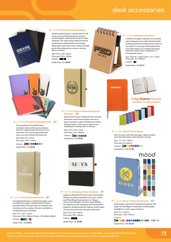73desk accessoriesUnless stated, prices include personalisation in one colour, one position. Origination, carriage and VAT are extra.Please contact our sales team for an up to date and accurate quotation on your chosen products.%uf0ec%u000973-15703 A5 Intimo Recycled NotebookA5 recycled wiro bound 60 sheet notebook with matching recycled pen. Great for making notes when you're out and about. Pen can be personalised at extra cost and is fitted with black ink.Size: 209 x 161 x 7mmPrint area: 190 x 110mmColours: %uf0a2%uf0a2%uf0a2%uf0a2%uf0a2%uf0a2%uf0a2%uf0a2%uf0a2Guide Price: 50 %u00a32.90%uf0ec%u000973-21449 A5 Natural Nebraska Recycled NotebookRecycled A5 natural notebook with coloured bookmark and coloured elastic closure to keep any pages in place. Notebook contains 90 lined sheets. Great size to keep in your handbag for making notes on the go.Size: 210 x 143 x 12mmPrint area: 195 x 100mmColours: %uf0a2%uf0a2%uf0a2%uf0a2%uf0a2%uf0a2%uf0a2Guide Price: 50 %u00a33.50SIMPSONS%uf0ec%u000973-10545 A6 Soft Feel NotebookSoft PU cover, with 96 lined pages, ribbon marker and coloured, elastic nylon band for closing.Size: 141 x 91 x 19mmPrint area: 50 x 60mmColours: %uf0a2%uf0a2%uf0a2%uf0a2%uf0a2%uf0a2%uf0a2%uf0a2%uf0a2%uf0a2Guide Price: 250 %u00a31.455 Day Express Service available on this product%uf0ec%u000973-38388 Mood%u00ae Softfeel Notebook A5High-quality soft feel A5 notebook containing 160 pages of lined 80gsm sustainable certified paper. Available in a wide range of colours.Size: 141 x 212mmPrint area: 100 x 195mmColours: %uf0a2%uf0a2%uf0a2%uf0a2%uf0a2%uf0a2%uf0a2%uf0a2%uf0a2%uf0a2%uf0a2%uf0a2%uf0a2%uf0a2%uf0a2%uf0a2%uf0a2%uf0a2%uf0a2%uf0a2%uf0a2%uf0a2Guide Price: 100 %u00a34.25%uf0e7 73-44785 Whiteboard NotebookCrafted from paper materials, this versatile spiral notepad comes with a board marker, making it perfect for jotting down notes on your desk or on the go. Personalised with your logo makes it an excellent giveaway option for trade shows, exhibitions, or promotional events.Size: 148 x 91 x 24mm (pen 114 x 11mm)Print area: 70 x 100mmColours: Guide Price: 50 %u00a33.17%uf0e7 73-44786 A5 Flexi Premium NotebookExuding sophistication, crafted with PU soft touch cover and 80 lined sheets of ivory recycled paper, reducing the need for virgin materials. The water based adhesive bound round spine is designed for easy tearing, allowing for quick and clean removal of page perfect for jotting down notes or sharing ideas on the go.Size: 210 x 140 x 14mmPrint area: 195 x 100mmColours: Guide Price: 50 %u00a35.95%uf0ec 73-44787 A5 Fruit Paper NotebookA5 notebook features a stylish fruit paper cover, recycled inner pages, recycled elastic closure, recycled ribbon and pen loop. It's compact and functional, with a variety of colours available to complement your branding.Size: 215 x 145 x 15mmPrint area: 195 x 100mm (Front), 145 x 80mm (Back)Colours: Guide Price: 50 %u00a34.22%uf0ec 73-44784 A5 Premium Nevus NotebookFeatures a Recycled PU outer cover and durable 950gsm recycled cardboard inner cover. Inside, you'll find 80 perforated sheets of 100gsm cream recycled paper with gun metal edging for a premium look. Equipped with back pocket, polyester double bookmark ribbons, elastic band closure and a pen loop with gun metal stud.Size: 214 x 145 x 20mmPrint area: 195 x 100mmColours: Guide Price: 50 %u00a35.90