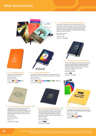 desk accessories 74 Unless stated, prices include personalisation in one colour, one position. Origination, carriage and VAT are extra.Please contact our sales team for an up to date and accurate quotation on your chosen products.%uf0ec%u000974-41032 Mood%u00ae Pocket Notebook A6High quality A6 notebook available in a wide range of colours, featuring soft-touch hard cover and sustainably sourced paper.Size: 90 x 143mmPrint area: 60 x 120mmColours: %uf0a2%uf0a2%uf0a2%uf0a2%uf0a2%uf0a2%uf0a2%uf0a2%uf0a2%uf0a2%uf0a2%uf0a2%uf0a2%uf0a2%uf0a2%uf0a2%uf0a2%uf0a2%uf0a2%uf0a2%uf0a2%uf0a2Guide Price: 100 %u00a32.50%uf0ec%u000974-28400 Spectrum A5 Hard Cover NotebookA5 notebook with matching colour elastic closure and ribbon. Includes 96 sheets, 60gsm lined paper.Size: 210 x 12 x 140mmPrint area: 55 x 55mmColours: %uf0a2%uf0a2%uf0a2%uf0a2%uf0a2%uf0a2%uf0a2%uf0a2%uf0a2%uf0a2Guide Price: 100 %u00a33.25%uf0ec%u000974-10438 Classic A6 Hard Cover Pocket NotebookThis exclusive design classic hard cover notebook with elastic closure and 80 sheets of 80gsm lined paper is ideal for writing and sharing notes. Features an expandable pocket at the back to keep small notes. Includes Journalbooks gift box sleeve.Size: 140 x 15 x 95mmPrint area: 50 x 50mmColours: %uf0a2%uf0a2Guide Price: 100 %u00a33.75%uf0ec%u000974-39579 Gianna Recycled Cardboard NotebookLightweight and flexible notebook for everyday notetaking. The cover is made of recycled cardboard. Features visible singer stitching on the spine and includes 80 sheets, 70 g/m%u00b2 100% FSC white lined paper. Made in Italy. Recycled carton, Recycled paper.Size: 205 x 125mmPrint area: 228 x 73mmColours: %uf0a2Guide Price: 100 %u00a33.65%uf0ec%u000974-44540 Shale Stone Paper Cahier JournalTear-resistant cahier journal featuring 32 sheets of 144 g/m%u00b2 lined white stone paper. Stone paper is 100% tree-free and the production process uses less energy compared to recycled or new pulp paper. It is also water resistant so liquids spilled can easily be wiped off.Size: 127 x 178mmPrint area: 60 x 60mmColours: %uf0a2%uf0a2%uf0a2Guide Price: 100 %u00a33.08%uf0ec%u000974-44354 Hemingway NotebookA5 PU notebook with plain sheets. Available in attractive colours.Size: 140 x 210mmPrint area: 80 x 150mmColours: %uf0a2%uf0a2%uf0a2%uf0a2%uf0a2%uf0a2%uf0a2%uf0a2%uf0a2%uf0a2Guide Price: 500 %u00a32.08%uf0e7%u000974-44755 Designer Full Colour A5 Casebound NotebookA5 casebound notebooks made in the UK, full colour to the entire cover to include any image or design. The cover material is paper based with a matt laminate soft touch protective layer. Choose from many paper options to include 100% recycled white lined, cream lined, plain or checked. The elastic strap and ribbon can match or contrast.Size: 142 x 215 x 12mmPrint area: all overColours: to orderGuide Price: 250 %u00a36.50