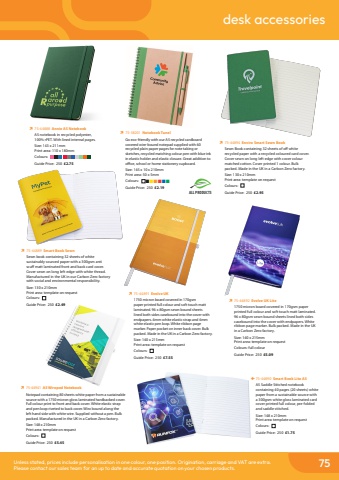 75desk accessoriesUnless stated, prices include personalisation in one colour, one position. Origination, carriage and VAT are extra.Please contact our sales team for an up to date and accurate quotation on your chosen products.%uf0ec%u000975-38201 Notebook TunelGo eco-friendly with our A5 recycled cardboard covered wire-bound notepad supplied with 60 recycled plain paper pages for note taking or sketches, recycled matching colour pen with blue ink in elastic holder and elastic closure. Great addition to office, school or home stationery cupboard.Size: 165 x 10 x 210mmPrint area: 50 x 5mmColours: %uf0a2%uf0a2%uf0a2%uf0a2%uf0a2%uf0a2%uf0a2Guide Price: 250 %u00a32.19ALL PRODUCTS%uf0ec%u000975-44888 Annie A5 NotebookA5 notebook in recycled polyester, 100% rPET. With lined internal pages.Size: 143 x 211mmPrint area: 110 x 180mmColours: Guide Price: 250 %u00a32.75%uf0ec%u000975-44892 Evolve UK Lite1750 micron board covered in 170gsm paper printed full colour and soft touch matt laminated. 96 x 80gsm sewn bound sheets lined both sides casebound into the cover with endpapers. White ribbon page marker. Bulk packed. Made in the UK in a Carbon Zero factory.Size: 140 x 215mmPrint area: template on requestColours: full colourGuide Price: 250 %u00a35.09%uf0ec%u000975-44894 Enviro Smart Sewn BookSewn Book containing 32 sheets of off white recycled paper with a recycled coloured card cover.Cover sewn on long left edge with cover colour matched cotton. Cover printed 1 colour. Bulk packed. Made in the UK in a Carbon Zero factory.Size: 130 x 210mmPrint area: template on requestColours: Guide Price: 250 %u00a32.95%uf0e7%u000975-44890 Smart Book Lite A5A5 Saddle Stitched notebook containing 40 pages (20 sheets) white paper from a sustainable source with a 300gsm white gloss laminated card cover printed full colour, pre-folded and saddle stitched.Size: 148 x 210mmPrint area: template on requestColours: Guide Price: 250 %u00a31.75%uf0ec%u000975-44891 Evolve UK1750 micron board covered in 170gsm paper printed full colour and soft touch matt laminated. 96 x 80gsm sewn bound sheets lined both sides casebound into the cover with endpapers. 6mm white elastic strap and 6mm white elastic pen loop. White ribbon page marker. Paper pocket on inner back cover. Bulk packed. Made in the UK in a Carbon Zero factory.Size: 140 x 215mmPrint area: template on requestColours: Guide Price: 250 %u00a37.55%uf0ec%u000975-44889 Smart Book SewnSewn book containing 32 sheets of white sustainably sourced paper with a 300gsm anti scuff matt laminated front and back card cover. Cover sewn on long left edge with white thread. Manufactured in the UK in our Carbon Zero factory with social and environmental responsibility.Size: 130 x 210mmPrint area: template on requestColours: Guide Price: 250 %u00a32.49%uf0ec%u000975-44941 A5 Wiropod NotebookNotepad containing 80 sheets white paper from a sustainable source with a 1750 micron gloss laminated hardbacked cover. Full colour print to front and back cover. White elastic strap and pen loop riveted to back cover. Wiro bound along the left hand side with white wire. Supplied without a pen. Bulk packed. Manufactured in the UK in a Carbon Zero factory.Size: 148 x 210mmPrint area: template on requestColours: Guide Price: 250 %u00a35.45