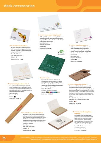 desk accessories 76 Unless stated, prices include personalisation in one colour, one position. Origination, carriage and VAT are extra.Please contact our sales team for an up to date and accurate quotation on your chosen products.%uf0ec%u000976-38329 NoteStix Sticky NotesA7 sticky note with a large print area to offer a greater branding space. Each pad contains 50 sheets of 80gsm white paper and printed 1 colour.Size: 105 x 75mmPrint area: 101 x 71mmColours: %uf0a2Guide Price: 250 %u00a31.08%uf0ec%u000976-42293 Sticky Smart Notes - A7A7 Sticky note containing 50 sheets of sticky note paper from a sustainable source, gummed along the long edge. Printed 1 colour each sheet. Bulk packed. Manufactured in the UK in our Carbon Zero factory.Size: 100 x 75mmPrint area: 90 x 53mmColours: %uf0a2Guide Price: 250 %u00a30.99%uf0ec%u000976-42294 Sticky Smart Notes - 3\3\sticky note paper from a sustainable source, gummed along the top edge. Printed 1 colour each sheet. Bulk packed. Manufactured in the UK in our Carbon Zero factory.Size: 75 x 75mmPrint area: 65 x 53mmColours: %uf0a2Guide Price: 250 %u00a31.02%uf0ec%u000976-43531 Enviro-Smart - Sticky Notes A7A7 Recycled Sticky note containing 50 sheets of recycled sticky note paper, gummed along the long edge. Bulk packed. Manufactured in the UK in our Carbon Zero factory.Size: 100 x 75mmPrint area: 90 x 53mmColours: %uf0a2Guide Price: 250 %u00a31.40%uf0ec%u000976-43719 Eco%u00b2Square book containing 75 sheets of recycled paper perfect bound to a square recycled coloured card cover. Bulk packed. Manufactured in the UK in our Carbon Zero factory with social and environmental responsibility. Fully recyclable.Size: 148 x 148mmPrint area: Template on requestColours: %uf0a2%uf0a2%uf0a2%uf0a2%uf0a2%uf0a2%uf0a2%uf0a2%uf0a2%uf0a2%uf0a2Guide Price: 250 %u00a33.49ALL PRODUCTS%uf0ec%u000976-38327 NoteStix Eco-CombisetEnvironmentally friendly, all recycled and all recyclable kraft sticky note combi-set which eliminates single use plastic. Combining four kraft paper adhesive page markers and a recycled kraft sticky note pad 70 x 75mm of 25 sheets all printed 1 colour in a kraft card cover. Price includes print to the cover, sticky note and all page markers in 1 colour.Size: 126 x 76 x 4mm closedPrint area: 126 x 156mm and 66 x 71mmColours: %uf0a2%uf0a2Guide Price: 500 %u00a32.45%uf0eb%u000976-44754 Grow Me Sticky Notes Memo PadEco-friendly Grow Me sticky notes memo pad. Soft wildflower mix seed paper cover. 50 sheets sticky grass paper memo pad. After recording your thoughts on the last sheet, plant the cover and watch it grow into a wildflower meadow. Made in EU.Size: 100x 70 x 6mmPrint area: 70 x 50mmColours: white/naturalGuide Price: 100 %u00a32.50TEMPO PLC%uf0eb%u000976-43794 Bamboo Ruler 30cm/12inchMade from 100% natural bamboo this ruler is the perfect eco friendly promotional item with both markings in centimetres and inches. Bamboo is sustainable material that is both durable and beautiful and is ideal for printing and engraving which looks great with your customers message.Size: 300mmPrint area: 260 x 15mmColours: %uf0a2Guide Price: 500 %u00a30.85