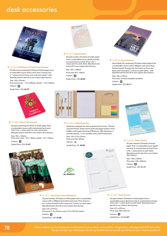Unless stated, prices include personalisation in one colour, one position. Origination, carriage and VAT are extra.Please contact our sales team for an up to date and accurate quotation on your chosen products.desk accessories78 Unless stated, prices include personalisation in one colour, one position. Origination, carriage and VAT are extra.Please contact our sales team for an up to date and accurate quotation on your chosen products.%uf0ec%u000978-28578 WiroSmart A5 Card Cover NotepadA5 Wiro pad containing 50 sheets of white paper from a sustainable source with a card cover. Pricing is for a 1 colour print to front cover and each sheet 1 side. Manufactured in the UK in our Carbon Zero factory.Size: 148 x 210mmPrint area: Cover - 133 x 200mm, Sheets - 133 x 200mmColours: %uf0a2Guide Price: 250 %u00a32.37%uf0ec%u000978-28238 Smart Book A5Smart Book A5 containing 50 sheets white paper from a sustainable source with a 300gsm card cover book. Perfect bound. Pricing is for full colour to front and back cover and spine, 1 colour to each sheet 1 side. Manufactured in the UK in our Carbon Zero factory.Size: 148 x 210mmPrint area: artwork template availableColours: %uf0a2Guide Price: 250 %u00a32.11%uf0eb%u000978-10271 Smart Pad Cover Notepad A4A4 pad contains 50 sheets of white paper from a sustainable source with a 300gsm laminated card cover. Price shown is for 1 colour printed on the cover and 1 colour on each sheet. Manufactured in the UK in our Carbon Zero factory.Size: 210 x 297mmPrint area: 212 x 297mm cover, 210 x 297mm sheetsColours: %uf0a2Guide Price: 250 %u00a32.88%uf0ec%u000978-18069 Smart Pad Cover A6A6 pad containing 50 sheets of white paper from a sustainable source with a laminated card cover. Price is for 1 colour print to cover and sheets. Manufactured in the UK in our Carbon Zero factory.Size: 105 x 148mmPrint area: cover - 95 x 138mm, sheets - 95 x 138mmColours: %uf0a2Guide Price: 250 %u00a31.67%uf0eb%u000978-42297 Smart Pad A4A4 pad contains 50 sheets of white paper from a sustainable source glued securely to a board back at head. Price is for 1 colour print to each sheet. Manufactured in the UK in our Carbon Zero factory.Size: 210 x 297mmPrint area: 200 x 287mmColours: %uf0a2Guide Price: 250 %u00a31.87%uf0ec%u000978-42296 Smart Pad A5A5 pad contains 50 sheets of white paper from a sustainable source glued securely to a board back at head. Price is for 1 colour print to each sheet. Manufactured in the UK in our Carbon Zero factory.Size: 148 x 210mmPrint area: 138 x 200mmColours: %uf0a2Guide Price: 250 %u00a31.17%uf0ec%u000978-42295 Smart Pad A6A6 pad contains 50 sheets of white paper from a sustainable source glued securely to a board back at head. Price is for 1 colour print to each sheet. Manufactured in the UK in our Carbon Zero factory.Size: 105 x 148mmPrint area: 95 x 138mmColours: %uf0a2Guide Price: 250 %u00a30.92ALL PRODUCTS%uf0ec%u000978-44876 Oxford Desk SetStationary notepad set with recycled carton cover. 70 lined recycled sheets. Sticky memo pads and page markers. Push ballpen with paper barrel and ABS parts, ABS sharpener, 2 wooden pencils, 15 cm wooden ruler, and PP protractor.Size: 150 x 210 x 25mmPrint area: 80 x 40mmColours: Guide Price: 50 %u00a34.85