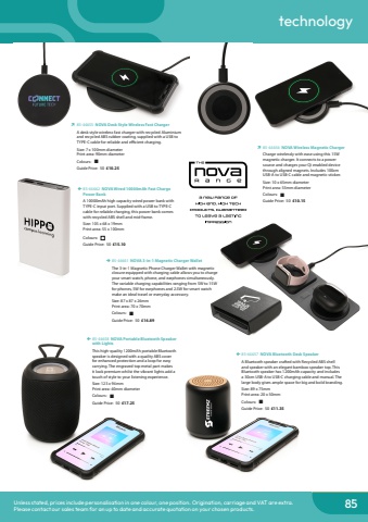 85technology Unless stated, prices include personalisation in one colour, one position. Origination, carriage and VAT are extra.Please contact our sales team for an up to date and accurate quotation on your chosen products.%uf0e7%u000985-44658 NOVA Portable Bluetooth Speaker with LightsThis high-quality 1200mAh portable Bluetooth speaker is designed with a quality ABS cover for enhanced protection and a loop for easy carrying. The engraved top metal part makes it look premium whilst the vibrant lights add a touch of style to your listening experience.Size: 123 x 94mmPrint area: 40mm diameterColours: %uf0a2Guide Price: 50 %u00a317.25%uf0e7%u000985-44657 NOVA Bluetooth Desk SpeakerA Bluetooth speaker crafted with Recycled ABS shell and speaker with an elegant bamboo speaker top. This Bluetooth speaker has 1200mAh capacity and includes a 30cm USB-A to USB-C charging cable and manual. The large body gives ample space for big and bold branding.Size: 89 x 75mmPrint area: 20 x 50mmColours: %uf0a2Guide Price: 50 %u00a311.35%uf0e8%u000985-44661 NOVA 3-in-1 Magnetic Charger WalletThe 3-in-1 Magnetic Phone Charger Wallet with magnetic closure equipped with charging cable allows you to charge your smart watch, phone, and earphones simultaneously. The variable charging capabilities ranging from 5W to 15W for phones, 5W for earphones and 2.5W for smart watch make an ideal travel or everyday accessory.Size: 87 x 87 x 26mmPrint area: 70 x 70mmColours: %uf0a2Guide Price: 50 %u00a314.89%uf0e7%u000985-44662 NOVA Wired 10000mAh Fast Charge Power BankA 10000mAh high capacity wired power bank with TYPE-C input port. Supplied with a USB to TYPE-C cable for reliable charging, this power bank comes with recycled ABS shell and mid-frame.Size: 105 x 68 x 19mmPrint area: 55 x 100mmColours: %uf0a2Guide Price: 50 %u00a315.10%uf0ec%u000985-44656 NOVA Wireless Magnetic ChargerCharge wirelessly with ease using this 15W magnetic charger. It connects to a power source and charges your Qi enabled device through aligned magnets. Includes 100cm USB-A to USB-C cable and magnetic sticker.Size: 10 x 65mm diameter Print area: 55mm diameterColours: %uf0a2Guide Price: 50 %u00a310.15%uf0ec%u000985-44655 NOVA Desk Style Wireless Fast ChargerA desk style wireless fast charger with recycled Aluminium and recycled ABS rubber coating, supplied with a USB to TYPE-C cable for reliable and efficient charging.Size: 7 x 100mm diameter Print area: 90mm diameterColours: %uf0a2Guide Price: 50 %u00a310.25