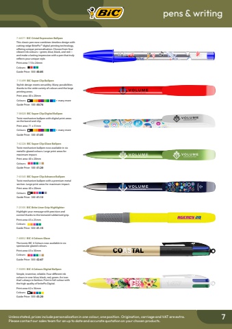 7pens & writingUnless stated, prices include personalisation in one colour, one position. Origination, carriage and VAT are extra.Please contact our sales team for an up to date and accurate quotation on your chosen products.7-15499 BIC Super Clip BallpenStylish design meets versatility. Many possibilities thanks to the wide variety of colours and the large printing areas.Print area: 40 x 20mmColours: + many moreGuide Price: 500 %u00a30.767-23105 BIC Brite Liner Grip HighlighterHighlight your message with precision and control thanks to the textured rubberised grip. Print area: 45 x 25mmColours: %uf0a2%uf0a2%uf0a2%uf0a2%uf0a2Guide Price: 500 %u00a31.157-38020 BIC Super Clip Digital BallpenTwist mechanism ballpen with digital print areas on the barrel and clip.Print area: 71 x 31mmColours: + many moreGuide Price: 500 %u00a31.057-40852 BIC 4 Colours GlaceThe iconic BIC 4 Colours now available in six spectacular glazed colours. Print area: 43 x 30mmColours: %uf0a2%uf0a2%uf0a2%uf0a2%uf0a2%uf0a2Guide Price: 500 %u00a32.677-35093 BIC 4 Colours Digital BallpenSimple, inventive, reliable. Four different ink colours in one: blue, black, red, green. An icon that's always in fashion. Print in full-colour with the high quality of britePix Digital. Print area: 62 x 36mmColours: %uf0a2%uf0a2%uf0a2%uf0a2%uf0a2%uf0a2Guide Price: 500 %u00a33.207-42226 BIC Super Clip Glace BallpenTwist mechanism ballpen now available in six metallic glazed colours. Large print areas for maximum impact. Print area: 40 x 20mmColours: %uf0a2%uf0a2%uf0a2%uf0a2%uf0a2%uf0a2Guide Price: 500 %u00a31.207-43545 BIC Super Clip Advance BallpenTwist mechanism ballpen with a premium metal section. Large print areas for maximum impact.Print area: 40 x 20mm Colours: %uf0a2%uf0a2%uf0a2%uf0a2%uf0a2%uf0a2%uf0a2Guide Price: 500 %u00a31.127-44571 BIC Cristal Expression BallpenThis classic pen now combines timeless design with cutting-edge BritePix%u2122 digital printing technology, offering unique personalisation. Choose from four vibrant ink colours%u2014green, blue, black, and red%u2014and make a lasting impression with a pen that truly reflects your unique style. Print area: 110 x 26mmColours: %uf0a2%uf0a2%uf0a2%uf0a2Guide Price: 500 %u00a30.85