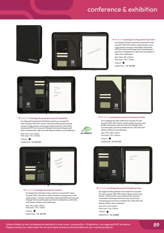89conference & exhibitionUnless stated, prices include personalisation in one colour, one position. Origination, carriage and VAT are extra.Please contact our sales team for an up to date and accurate quotation on your chosen products.Lunch 12.30%uf0e7%u000989-43724 Sundridge Eco Recycled A4 Zip FolderEco Zipped A4 Folio made from recycled PU with recycled 190T rPET interior. Inside pocket, mesh cargo pocket, business card holder, elasticated rPET pen loop and 30 page lined recycled paper pad. Each notebook has a QR code with details of fabric and certification.Size: 326 x 245 x 25mmPrint area: 170 x 125mmColours: %uf0a2Guide Price: 100 %u00a313.35%uf0ec%u000989-43723 Sundridge Recycled A4 Conference FolderEco Unzipped A4 Folio made from recycled PU with recycled 190T rPET interior. Inside pocket, business card holder, elasticated r-pet pen loop and 20 page lined recycled paper pad. Each notebook has a QR code with details of fabric and certification.Size: 320 x 240 x 70mmPrint area: 170 x 125mmColours: %uf0a2Guide Price: 100 %u00a311.35.Charger.Phone.CaseMaryJoSimonJeffext 2006John%uf0ec%u000989-43725 Sundridge Recycled A4 CalcfolioEco Zipped A4 Calculator Folio made from recycled PU with a recycled 190T r-Pet interior. With calculator, Inside pocket, mesh cargo pocket, business card holder, elasticated rPET pen loop and 20 page lined recycled paper pad. Each notebook has a QR code with details of fabric and certification.Size: 326 x 245 x 25mmPrint area: 170 x 125mmColours: %uf0a2Guide Price: 100 %u00a317.35%uf0ec%u000989-43727 Sundridge Recycled Oversized A4 TabletfolioEco Zipped Oversized A4 Tabletfolio made from recycled PU with recycled 190T rPET interior. Soft lined tablet pocket with rip closure, Inside pocket, mesh cargo pocket, business card holder, elasticated rPET pen loop and 20 page lined recycled paper pad. Each notebook has a QR code with details of fabric and certification.Size: 355 x 273 x 25mmPrint area: 170 x 125mmColours: %uf0a2Guide Price: 100 %u00a317.35%uf0ec%u000989-43726 Sundridge Recycled A4 Ringbinder FolioEco Zipped A4 Ring-Binder Folio made from recycled PU with recycled 190T rPET interior. Black metal 4 ringbinder, inside pocket, mesh cargo pocket, business card holder, elasticated rPET pen loop and 20 lined recycled paper pad. Each notebook has a QR code with details of fabric and certification.Size: 355 x 273 x 25mmPrint area: 170 x 125mmColours: %uf0a2Guide Price: 100 %u00a316.85ALL PRODUCTS