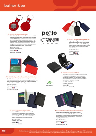 conference & exhibition leather & pu92 Unless stated, prices include personalisation in one colour, one position. Origination, carriage and VAT are extra.Please contact our sales team for an up to date and accurate quotation on your chosen products.%uf0ec%u000992-43566 Eco Express Porto Recycled Credit Card CaseCredit Card Case made from Porto material which is recycled from waste plastic bottles that would normally go to landfill. This high-quality recycled vegan material has a subtle grain and is ideal for deboss, foil blocked or digitally printed branding.Size: 99 x 72 x 5mmPrint area: 78 x 46mmColours: %uf0a2%uf0a2%uf0a2Guide Price: 50 %u00a36.35%uf0ec%u000992-43570 Eco Express Passport WalletPassport Wallet made from Porto material which is recycled from waste plastic bottles that would normally go to landfill. This high-quality recycled vegan material has a subtle grain and is ideal for deboss, foil blocked or full colour branding.Size: 100 x 138mmPrint area: 70 x 110mmColours: %uf0a2%uf0a2Guide Price: 50 %u00a35.59%uf0ec%u000992-43565 Eco Express Porto Recycled Credit or ID Card CaseCredit Card Case made from Porto material which is recycled from waste plastic bottles that would normally go to landfill. This high-quality recycled vegan material has a subtle grain and is ideal for deboss or foil blocked branding.Size: 98 x 67 x 5mmPrint area: 78 x 42mmColours: %uf0a2%uf0a2%uf0a2Guide Price: 50 %u00a33.29pet plastic bottlesground to chipsmeltedinto yarnwoven to material%uf0ec%u000992-44335 Eco Express Tech PouchZipped Tech Pouch made from Porto material which is recycled from waste plastic bottles that would normally go to landfill. This high-quality recycled vegan material has a smooth grain ideal for deboss, foil blocked or full colour branding.Size: 200 x 160 x 70mmPrint area: 90 x 90mmColours: %uf0a2Guide Price: 50 %u00a318.29%uf0ec%u000992-44336 Eco Express AirTag HolderDeluxe AirTag Holder made from Porto material which is recycled from waste plastic bottles that would normally go to landfill. This high-quality recycled vegan material has a smooth grain ideal for deboss, foil blocked or full colour branding. This item is stocked in black, navy, red and white. Features include - Domed design, Stitched to edge, Press stud to secure, Chrome Split Ring 30mm, Designed to fit an Apple AirTag - not included.Size: 95 x 45 x 3mmPrint area: 26mm diameterColours: %uf0a2%uf0a2%uf0a2Guide Price: 100 %u00a32.95%uf0ec%u000992-43571 Eco Express Large Luggage TagLarge Luggage Tag made from Porto material which is recycled from waste plastic bottles that would normally go to landfill. This highquality recycled vegan material has a smooth grain ideal for deboss, foil blocked or full colour branding.Size: 72 x 125 x 4mmPrint area: 53 x 72mmColours: %uf0a2%uf0a2%uf0a2%uf0a2Guide Price: 50 %u00a35.25ALL PRODUCTS