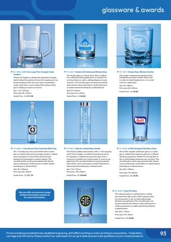 Unless stated, prices include personalisation in one colour, one position. Origination, carriage and VAT are extra.Please contact our sales team for an up to date and accurate quotation on your chosen products.93glassware & awardsPrices include personalisation by sandblast engraving, etch effect printing or colour printing in one position. Origination, carriage and VAT extra. Please contact our sales team for an up to date and accurate quotation on your chosen products.We can offer an extensive range of Glassware please contact us for more information.%uf0ec%u000993-18062 0.67 Litre Large Plain Straight Sided TankardSimple yet elegant in design the large plain straight sided tankard has plenty of room for engraving. It can be personalised with any crest, logo or wording to create a gift that is sure to take pride of place when put on display at work or at home.Size: 154 x 102mmPrint area: 85 x 70mmGuide Price: 24 %u00a311.50%uf0ec%u000993-14679 Dimple Base Whisky TumblerThe simple contemporary design of the Dimple Base whisky tumbler lends itself to make an ideal display item, or it can be used on a daily basis.Size: 95 x 80mmPrint area: 60 x 60mmGuide Price: 24 %u00a39.20%uf0ec%u000993-44637 Double Old Fashioned Whisky GlassThe whisky glass is a classic piece that is crafted for a refined drinking experience. It is perfect for serving whisky or spirits, adding elegance to any occasion. This versatile glass can be personalised with vibrant colour printing for a bold statement or subtle etched branding for a refined finish.Size: 83 x 92mmPrint area: 45 x 45mmGuide Price: 24 %u00a36.50%uf0ec%u000993-44634 1 Litre Round Flip Top Bottle White TopThe 1-litre flip-top cork round bottle with a white top is a stylish and practical storage solution. Crafted from clear glass, its secure flip-top lid ensures freshness for beverages or pantry staples. This versatile bottle can be personalised with vibrant colour printing for a bold accent or subtle etched branding for a refined finish.Size: 96 x 320mmPrint area: 60 x 50mmGuide Price: 24 %u00a311.15%uf0ec%u000993-44632 Atlantis Lidded Water BottleThe Atlantis lidded water bottle, with a 1-litre capacity and 275mm height, is a stylish and practical choice for hydration. Crafted from premium glass with a secure lid, its perfect for serving water or wine at any gathering. This versatile bottle can be personalised with vibrant colour printing for a bold statement or subtle etched branding for a refined touch.Size: 78 x 275mmPrint area: 160 x 60mmGuide Price: 50 %u00a324.69%uf0ec%u000993-44940 0.58ltr Straight Sided Beer GlassThe 0.58ltr straight-sided beer glass is a stylish piece, crafted from premium glass for a refined drinking experience. Perfect for serving beer or ale, its sleek design enhances any occasion. This versatile glass can be personalised with vibrant colour printing for a bold effect or subtle etched branding for a refined touch.Size: 80 x 180mmPrint area: 50 x 60mmGuide Price: 48 %u00a37.95%uf0e7%u000993-44636 Tulip Pint GlassThe tulip pint glass is a refined piece, crafted from premium glass with a 20oz capacity. Ideal for serving beer or ale, its sleek tulip design elevates any gathering. This versatile glass can be personalised with vibrant colour printing for a striking statement or subtle etched branding for a refined finish.Size: 85 x 159mmPrint area: 50 x 70mmGuide Price: 50 %u00a35.40