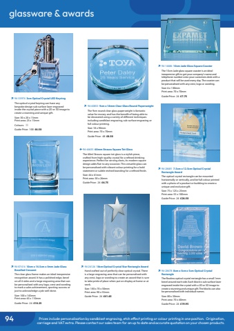 conference & exhibition glassware & awards94 Prices include personalisation by sandblast engraving, etch effect printing or colour printing in one position. Origination, carriage and VAT extra. Please contact our sales team for an up to date and accurate quotation on your chosen products.%uf0ec%u000994-40853 9cm x 18mm Clear Glass Round PaperweightThe 9cm round clear glass paperweight is fantastic value for money and has the benefit of being able to be decorated using a variety of different techniques including sandblast engraving, sub surface engraving or full colour printing.Size: 18 x 90mmPrint area: 70 x 70mmGuide Price: 48 %u00a38.50%uf0ec%u000994-07416 10cm x 14.5cm x 5mm Jade Glass Bevelled CrescentThe clear glass frame makes an ideal inexpensive recognition award. It has a polished edge, bevel on all 4 sides and a large engraving area that can be personalised with any logo, crest and wording to mark a sales achievement, sporting success or just to acknowledge a job well done.Size: 100 x 145mmPrint area: 65 x 110mmGuide Price: 24 %u00a310.25%uf0ec%u000994-26126 18cm Optical Crystal Star Rectangle AwardHand crafted out of perfectly clear optical crystal. There is a large engraving area that can be personalised with any crest, logo or wording to create an award that is sure to take pride of place when put on display at home or at work.Size: 180 x 70 x 50mmPrint area: 90 x 55mmGuide Price: 24 %u00a341.65%uf0ec%u000994-28481 7.5cm x 12.5cm Optical Crystal Rectangle AwardThe optical crystal rectangle can be mounted horizontally or vertically, and be full colour printed with a photo of a product or building to create a unique and exclusive gift.Size: 75 x 125 x 25mmPrint area: 55 x 100mmGuide Price: 24 %u00a326.50%uf0ec%u000994-33974 3cm Optical Crystal LED KeyringThe optical crystal keyring can have any bespoke design sub surface laser engraved inside the crystal piece with a 2D or 3D image to create a stunning and unique gift.Size: 30 x 20 x 15mmPrint area: 25 x 15mmColours: %uf0a2Guide Price: 100 %u00a36.50%uf0ec%u000994-14686 10cm Jade Glass Square CoasterThe 10cm Jade glass square coaster is an ideal inexpensive gift to get your company%u2019s name and telephone number onto your customers desk with a product that will be used every day. The coaster can be personalised with any crest, logo or wording.Size: 6 x 100mmPrint area: 70 x 70mmGuide Price: 24 %u00a37.75%uf0e7%u000994-44635 60mm Strauss Square Tot GlassThe 60ml Strauss square tot glass is a stylish piece, crafted from high-quality crystal for a refined drinking experience. Perfect for serving shots, its modern square design adds flair to any occasion. This versatile glass can be personalised with vibrant colour printing for a bold statement or subtle etched branding for a refined finish.Size: 44 x 61mmPrint area: 30 x 26mmGuide Price: 24 %u00a36.75%uf0ec%u000994-28478 8cm x 5cm x 5cm Optical Crystal RectangleThe flawless optical crystal rectangle has a small 1mm bevel around each side. Each block is sub surface laser engraved inside the crystal with a 2D or 3D image to create a stunning and unique gift. The blocks can also be personalised with individual names.Size: 80 x 50mmPrint area: 70 x 40mmGuide Price: 24 %u00a319.95